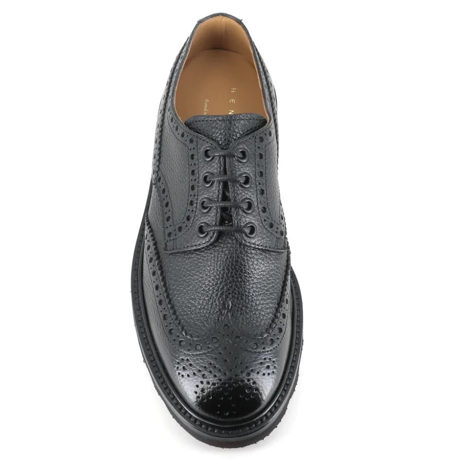Henderson Baracco brogue i blødt, sort læder, afsluttet med klassiske brogue-perforeringer og en rund tå. Skoen har et foret interiør og en lædersål parret med en Lactae Hevea latex ydersål. Bemærk: modelnavnet kunne ikke bekræftes fra tilgængelige kilder; GEORGE.P.2BLACK blev angivet som en produktkode. Vigtige egenskaber: Sort | Læder | Foret interiør | Lædersål | Lactae Hevea latex ydersål | Brogue detaljer | Rund tå | Snørelukning | Dimensioner & pasform: Hæl: 3 cm | Passer normal i størrelsen. | Sammensætning & pleje: Læder (overdel) | Lædersål | Lactae Hevea latex (ydersål)