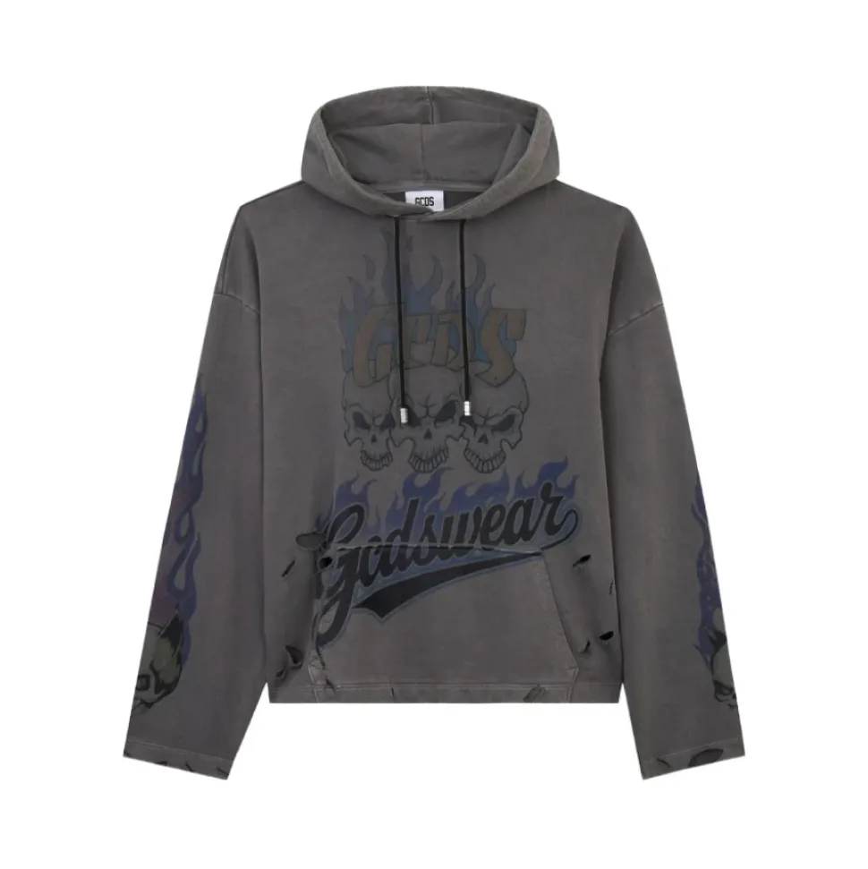 GCDS Hoodie har et mørkt grafisk tryk og distressed detaljer, der giver et streetwear-inspireret look. Den kombinerer en hætte med snøre og en kængurulomme for praktisk hverdagsbrug. Vigtige egenskaber: Grå | Grå | Blå | Hætte med snøre | Kængurulomme | Grafisk tryk | Distressed detaljer | Hætte