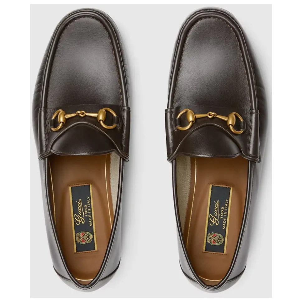 Gucci Horsebit 1953 Loafer kombinerer husets signatur Horsebit med en guldfarvet spænde og en lædersål for et raffineret hverdagslook. Designet til smarte, afslappede outfits og passer let til skræddersyede bukser eller denim. Vigtigste egenskaber: Mørkebrun | Kalvelæder | Lædersål | Slip-on konstruktion | Guldfarvet spænde | Horsebit detalje | Mål og pasform: Højde: 15 mm | Sammensætning og pleje: 100% kalvelæder | Sål: 100% læder