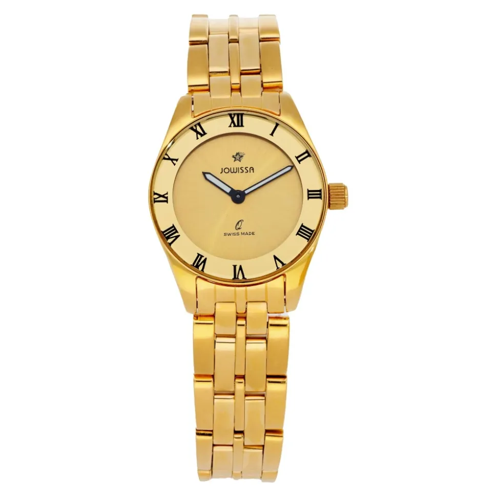 Jowissa J7.014.S Uret har et schweizisk quartz urværk i en slank guldfarvet urkasse i rustfrit stål med et matchende armbånd. Det kombinerer præcis tidtagning med et raffineret, minimalistisk to-viser design. Vigtige egenskaber: Guld | Rustfrit stål | Schweizisk quartz urværk | Vandtæthed: 3 ATM (regntæt) | Hærdet mineralglas | Swiss Made | Timer og minutter visning | Armbånd i rustfrit stål | Clipslås i rustfrit stål med logo | Guld urskive | Guldfarvet urkasse | Minimalistisk to-viser layout | Dimensioner og pasform: Urkassens diameter: 30 mm | Urkassens højde: 6,5 mm | Sammensætning og pleje: Rustfrit stål | Hærdet mineralglas