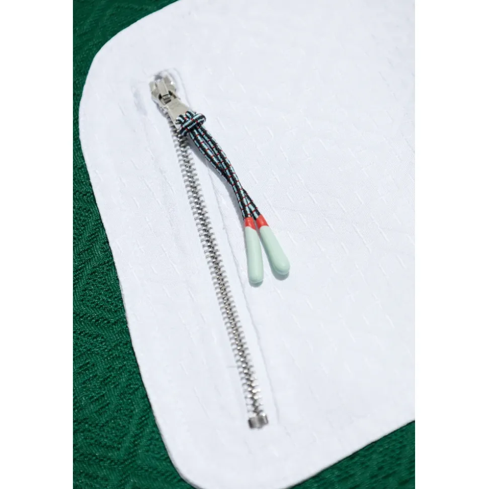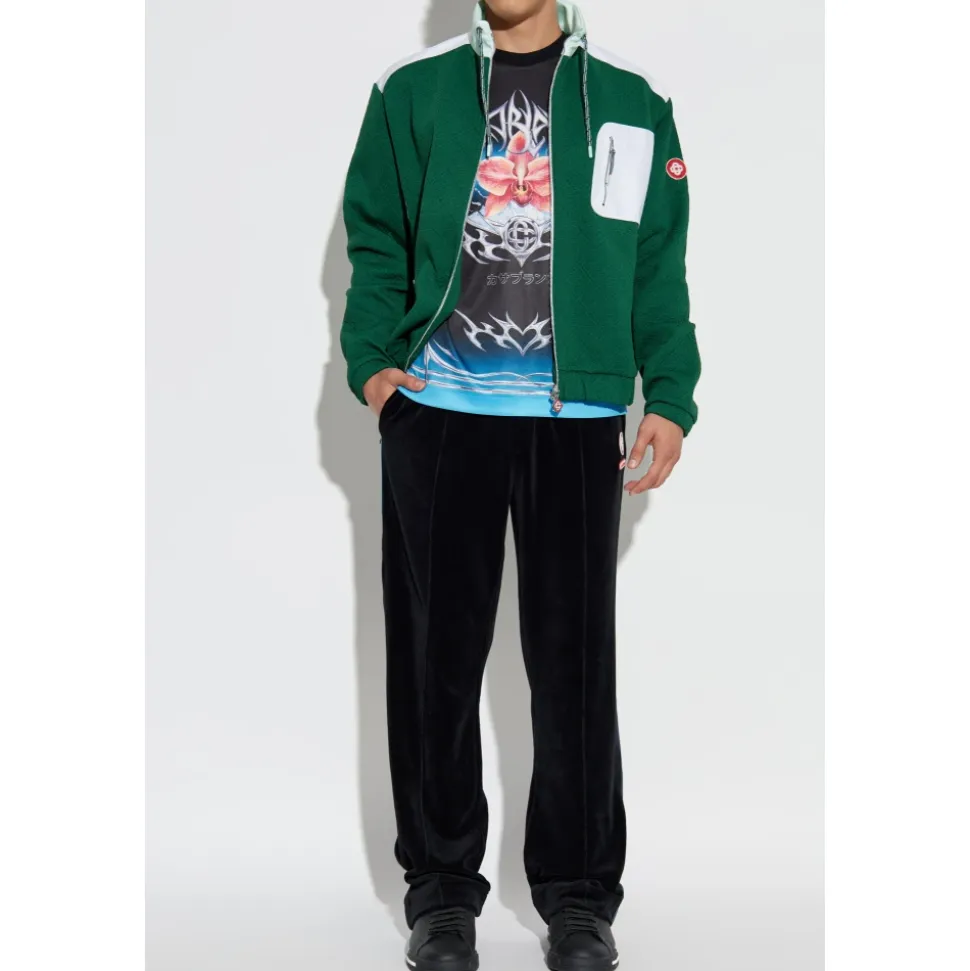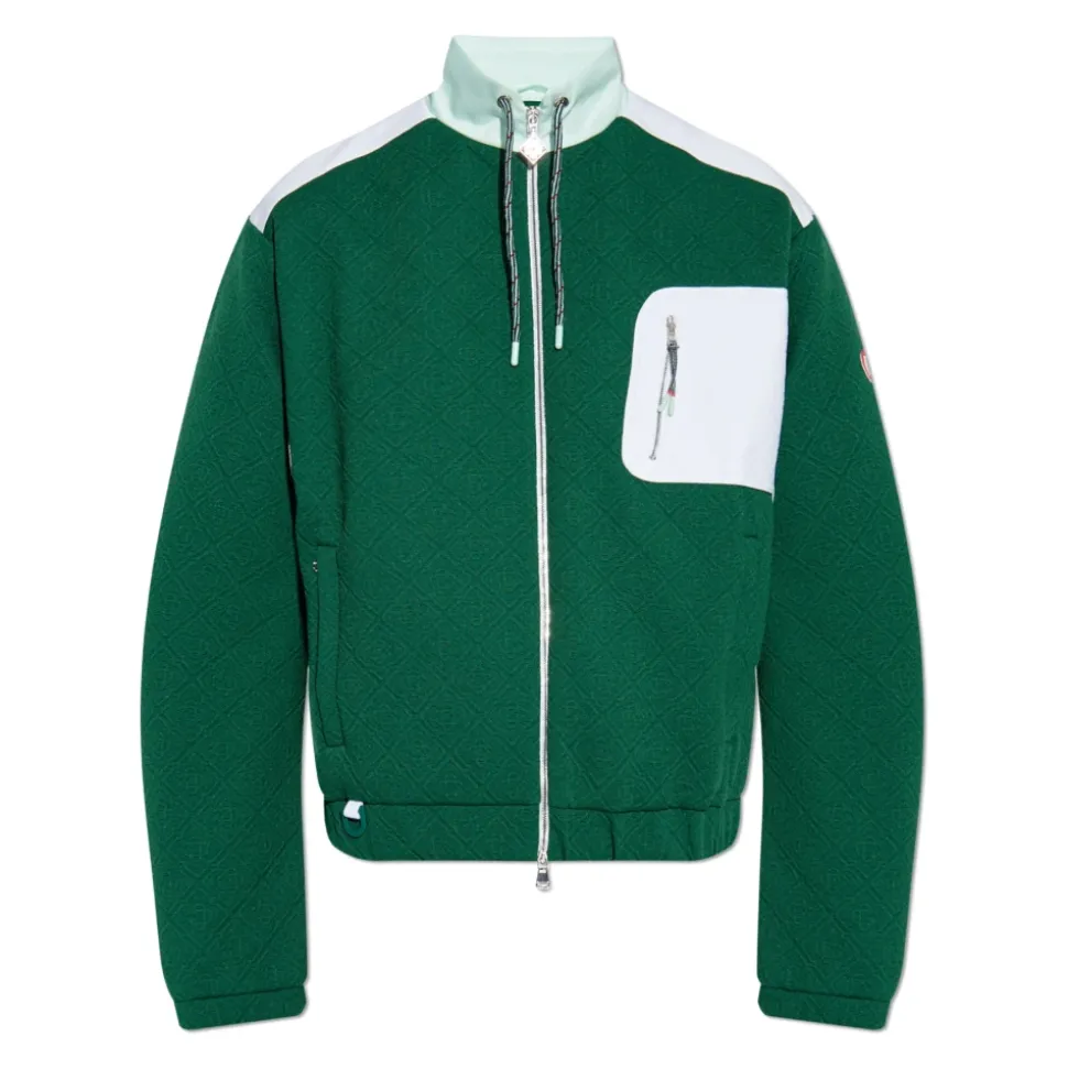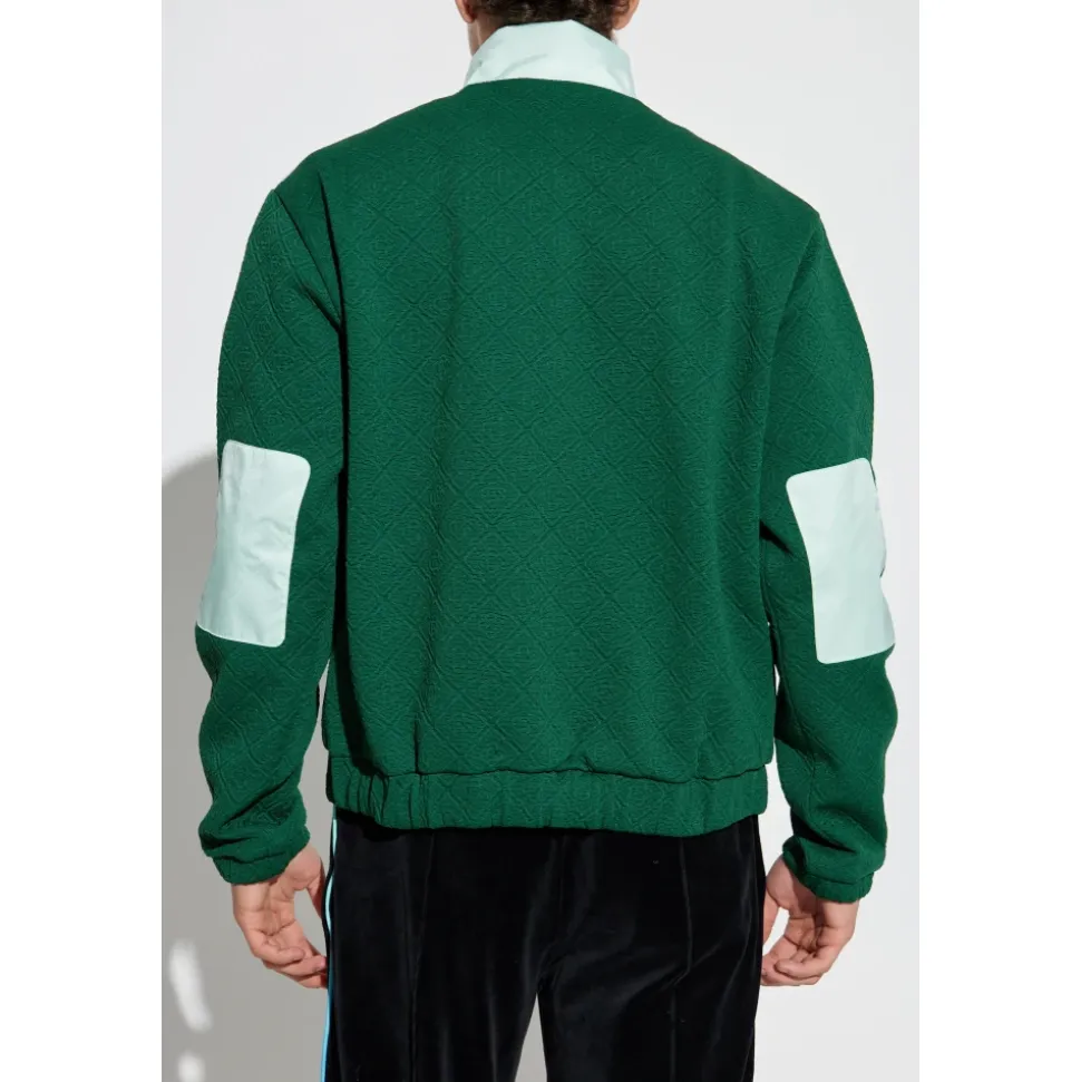 STAND-COLLAR JAKKEN fra Casablanca er en raffineret erklæring om luksus og subtil nonchalance inspireret af Middelhavsæstetik. Dens DYBE GRØNNE nuance, suppleret med mynte accenter på kraven, skuldrene og albuerne, giver en følelse af friskhed og lethed, mens den KLASISKE BOMBER SILHUET med ribbede kanter og lige ærmer sikrer tidløs elegance. Stoffet, der har en tydelig geometrisk tekstur, væver moderne struktur sammen med kunstnerisk lethed, mens DEN STORE HVIDE BRYSTLOMME og kontrastpaneler definerer produktets unikke identitet. Dekorative snoretræk i stand-kraven med mynte detaljer fremhæver den omhyggelige opmærksomhed på detaljer. At vælge denne jakke er en udtryk for værdsættelse af marokkansk-parisisk håndværk og moderne komfort.