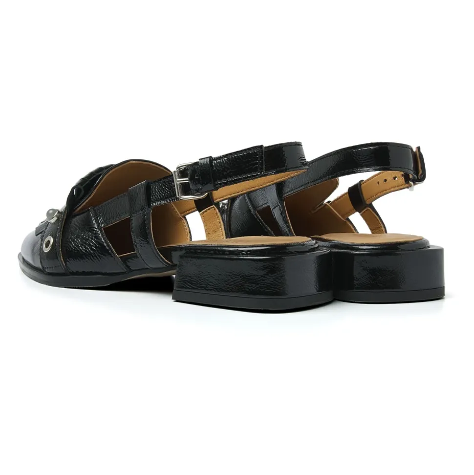 Oplev Jazz Tammi Sandaler fra Via Vai, en perfekt blanding af femininitet og kant. Disse slingbacks har en luksuriøs laklæderfinish, hvilket gør dem til en alsidig tilføjelse til enhver garderobe. Produkt detaljer: Sort | Højkvalitets laklæder | Justerbar hælstrop | Diskret blokhæl | Spids tå | Frynsedetaljer med sølv studs på vristen | Sammensætning og pleje: Læderforing