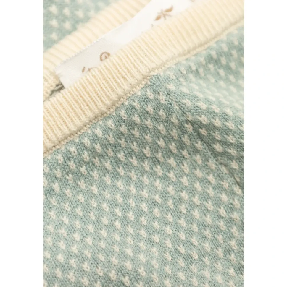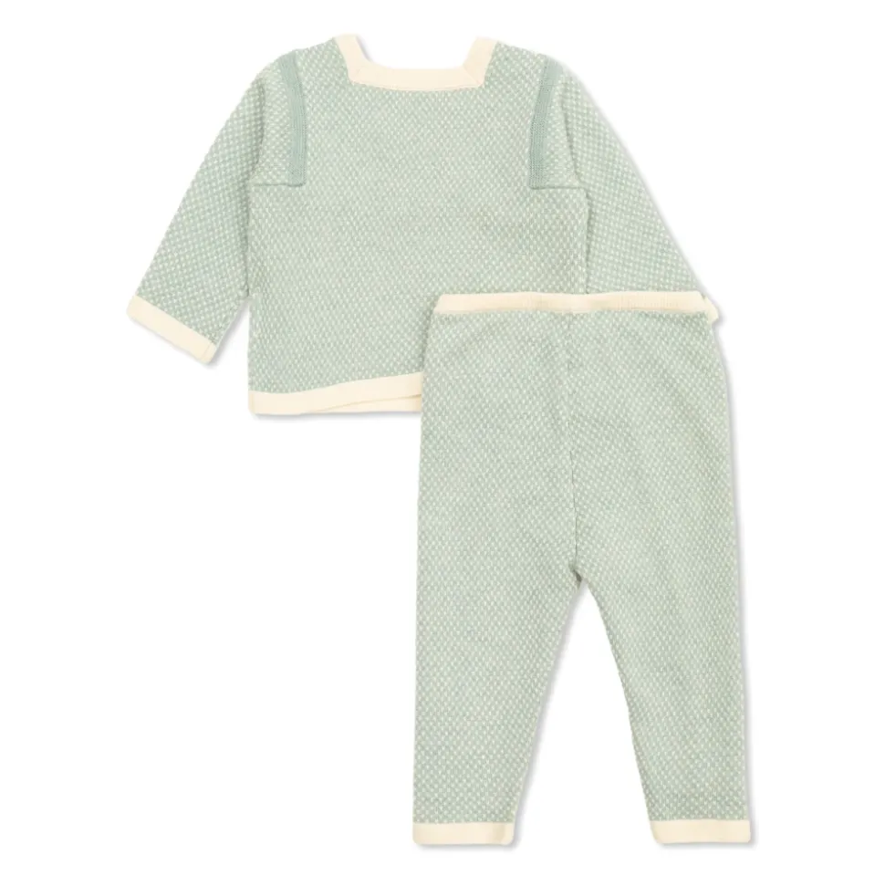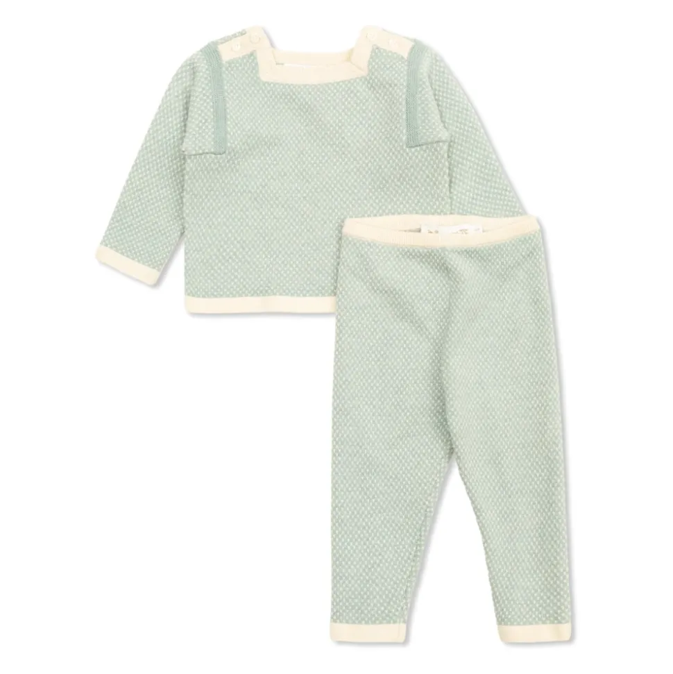 Bonpoint Joe Sæt kombinerer en blød sweatshirt i uld og bomuld med matchende bukser for et raffineret hverdagslook med fokus på komfort og subtile detaljer. Vigtige egenskaber: Grøn | Uld og bomuld | Blød og skånsom mod sart hud | Omhyggeligt vævet for bemærkelsesværdig blødhed | Koordineret todelt sæt (sweatshirt og bukser) | Rektangulær halsudskæring | Klassiske bukser | Delikat hvidt mikromønster | Cremefarvede afslutninger ved halsudskæring, ærmer og linning | Sammensætning & pleje: Bomuld | Uld