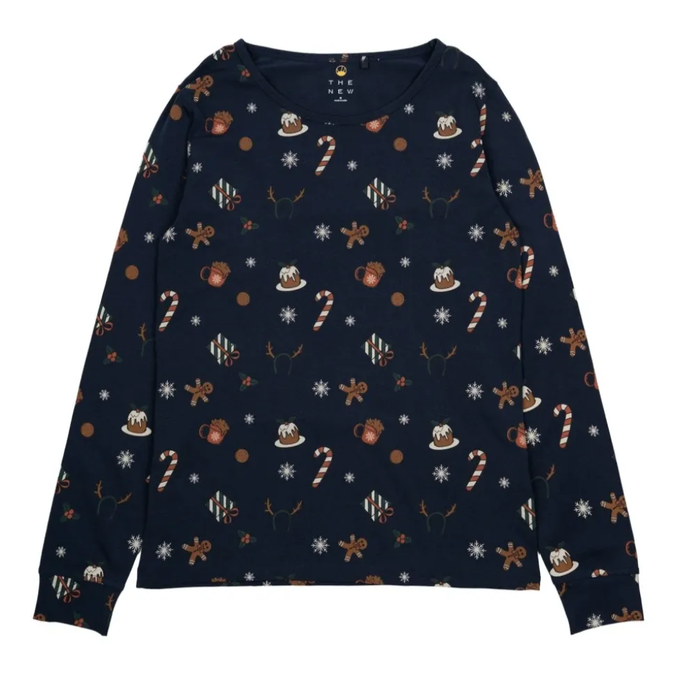 THE NEW – Holiday Nightset Adult, TN5959 – Navy Blazer. En dejlig natdragt til voksne fra THE NEW. I en smuk mørkeblå farve med et festligt juleprint over det hele, herunder gaver, julestokke, pebernødder, varm kakao, grene, bær og snefnug. Sættet inkluderer leggings med elastik i taljen og en langærmet bluse. Materiale: 95% bomuld, 5% elastan. GOTS certificeret. Vask: 30 grader – vask indvendigt. Husk at følge vaske- og plejeinstruktioner. Stilnummer: TN5959_Navy Blazer AOP.