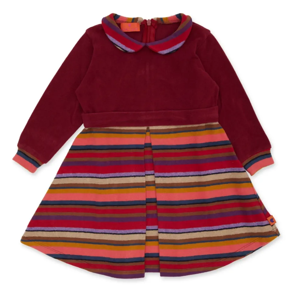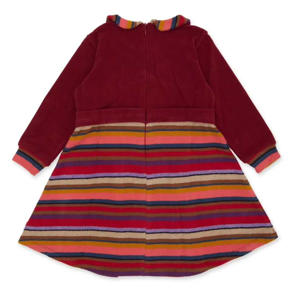 Gallo fleecedragt med et ensfarvet bordeauxfarvet overdel og et flerfarvet stribet skørt, designet til varme og hverdagsbrug. Vigtige egenskaber: Flerfarvet | Bordo | Fleece | Varm og isolerende | Komfortabel | Lange ærmer | Ensfarvet bordeauxfarvet overdel | Flerfarvet stribet skørt | Blød fleecetekstur