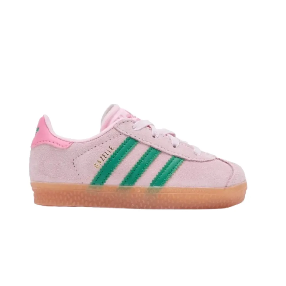 Præsenterer Adidas Gazelle sneaker til unge modeentusiaster, der har den ikoniske Adidas-stil fra 1991. Fremstillet med overdel i ruskind og kontrast 3 striber, disse sneakers tilbyder nem på- og afklædning med elastiske snørebånd og en polstret indersål for ekstra komfort. Oprindeligt en design med høj ydeevne, er denne sneaker nu en tidløs klassiker, der har overgået generationer. Klassisk pasform med overdel i ruskind, elastiske snørebånd, tekstilforing, OrthoLite® indersål, gummisål. Farve: Clear Pink / Court Green / Bliss Pink. Varenummer: JP7138.