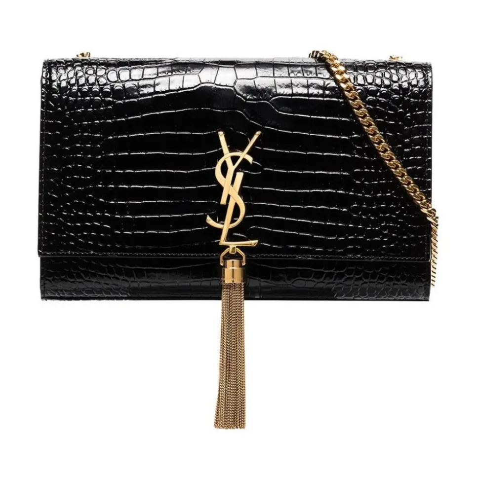 Saint Laurent Kate Medium Taske i krokodillepræget læder med kvast kombinerer en kompakt kuvertsilhuet med en statement-kvast og kæderem, der er raffineret til brug fra dag til aften. Vigtige egenskaber: Sort | Kalvelæder | Magnetisk klaplukning | Skulderrem i metalkæde | Indvendig slidslomme | Krokodillepræget tekstur | Kuvertklap | Foring med patenteffekt | Metalkvastdetalje | Logo-plade foran | Mål og pasform: Højde: 14,5 cm | Bredde: 24 cm | Dybde: 5,5 cm | Skulderremmens længde: 48 cm | Sammensætning og pleje: 100 % kalvelæder | Foring: læder (patenteffekt)