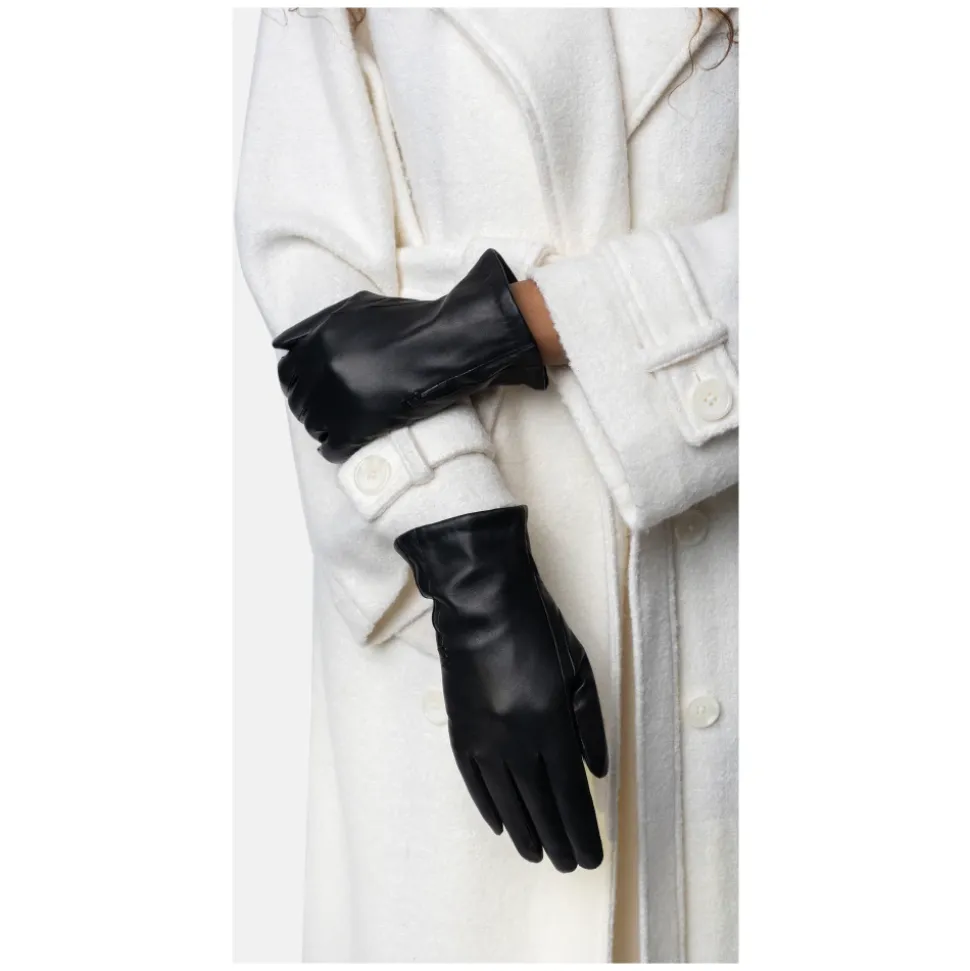 RE:DESIGNED Kayla Uld Glove kombinerer smidigt læder med et blødt uldfor, der giver varm og behagelig brug. Touchscreen-kompatible fingerspidser giver dig mulighed for at bruge din smartphone uden at tage handskerne af. Vigtige egenskaber: Sort | Læder | Uldforet for varme | Touchscreen-kompatible fingerspidser (tommel- og pegefinger) | Uldfor | Feminin frontdetalje | Blød læderkonstruktion | Klassisk handskesilhuet | Sammensætning og pleje: 100% læder | Uld (for)