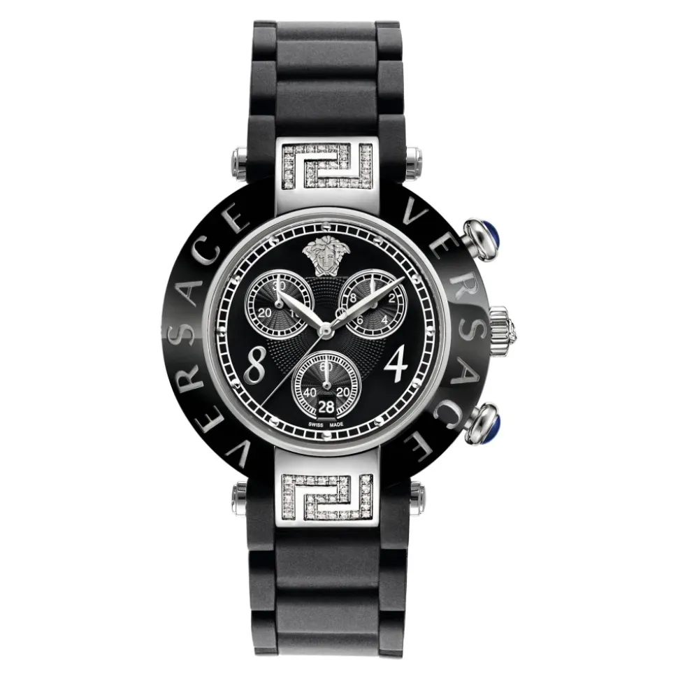 Forhøj din stil med dette fantastiske Versace dameur. Med et sort keramisk urkasse med Greca-mønster, en sort urskive med sølvfarvede visere og indekser, og det ikoniske Medusa Head-logo kl. 12. Dette ur leveres med et sort gummirem, kvartsbevægelse, ridsefast safirglas og er vandtæt op til 50 meter. Den perfekte kombination af elegance og funktionalitet. Swiss Made.
