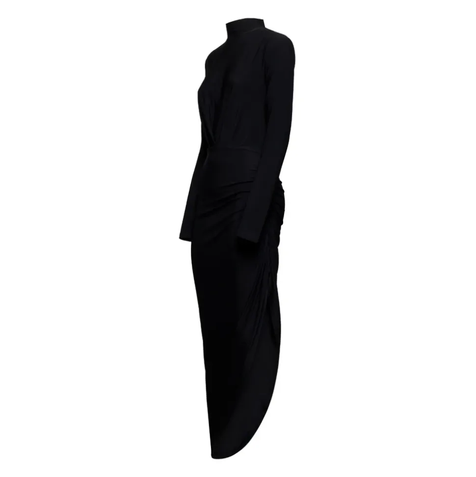 Silvian Heach Kirundo Dress er en figursyet lang kjole, der defineres af asymmetrisk drapering og en dramatisk kant. Designet til aftenbegivenheder fremhæver den silhuetten med rynkede detaljer og en elegant høj halsudskæring. Vigtige egenskaber: Sort | Nero | Polyester | Høj elasticitet | Bevægelsesfrihed | Høj halsudskæring | Sidedrapering | Asymmetrisk kant | Rynke-/rynkede detaljer | Figursyet silhuet | Mål og pasform: Længde: 82/132 cm (størrelse 36) | Underarmsbredde: 41 cm (størrelse 36) | Taljebredde: 32 cm (størrelse 36) | Hoftebredde: 49 cm (størrelse 36) | Figursyet silhuet | Høj elasticitet for komfortabel pasform | Sammensætning og pleje: 94% Polyester | 6% Elastan