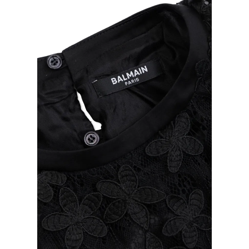 Balmain præsenterer kjolen med blomsterprint – en raffineret model, der defineres af slående, tredimensionelle blomsterapplikationer i meshblonde. Designet kombinerer en rund halsudskæring og korte ærmer med en løs, let udvidet form for behageligt, festligt brug. Vigtige egenskaber: Sort | Bomuld | Viskoseforing ved sømmen for komfort | Diskret lukning med to knapper bagpå | Rund halsudskæring med mat kant | Korte ærmer | Tredimensionelle blomsterapplikationer fremstillet af delvist gennemsigtig meshblonde | All-over blomsterapplikationsdekoration | Dimensioner og pasform: Løs, let udvidet pasform | Sammensætning og pleje: Bomuld | Elastan | Polyamid | Polyester | Viskose