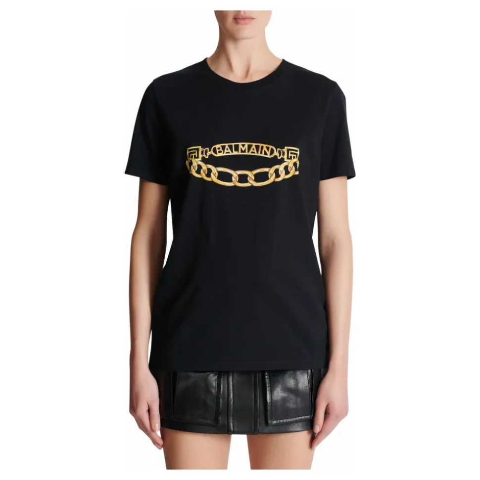 Trykt Balmain Chain-logo T-shirt Rund hals med ribkant Korte ærmer Balmain Chain-logo trykt på forsiden Almindelig pasform Model måler 178 cm og bruger en størrelse S Hovedmateriale: 100% bomuld Lavet i Portugal Vare: FF1EF004GE97 100% af bomuldsfibrene, der bruges til at lave dette tøj, er certificeret og dyrket