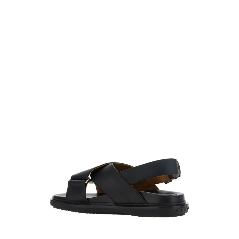 Træd ind i komfort og stil med Marnis læder Fussbett Sandaler til kvinder. Disse ikoniske flade sandaler har en dobbelt krydsende frontrem, åben tå og justerbar ankelrem for en sikker pasform. Den logo-prægede indersål tilføjer et strejf af luksus. Lavet i Italien af 100% kalveskind og gummi. Varenummer: FBMS015701P3614_00N99. Sæson: AW25.