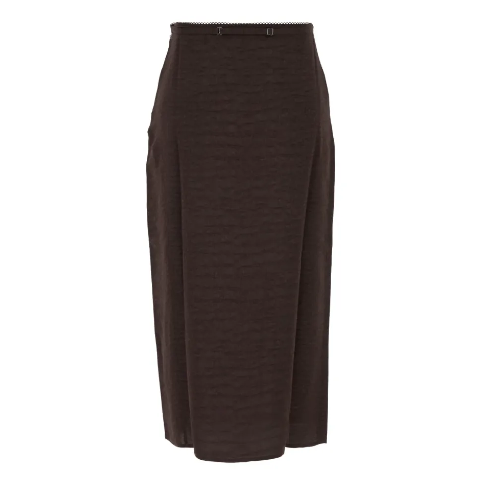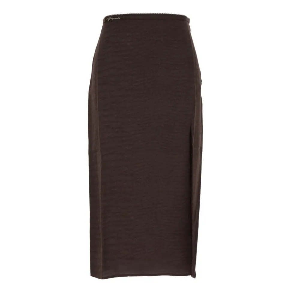 Jacquemus La Jupe Notte er en midi-nederdel i croco-brun viskose jacquard, designet til elegant brug fra dag til aften. Den har en høj talje og en lang sideslids for en raffineret, flatterende silhuet. Vigtige egenskaber: Brun | Croco-brun | Viskose | Justerbar lingeristrop | Skjult side lynlåslukning | Krokodille jacquard tekstur | Logo med guldmetal charm | Lang sideslids | Dimensioner og pasform: Straight fit | Længde under knæet | Høj talje | Sammensætning og pleje: 100% Viskose