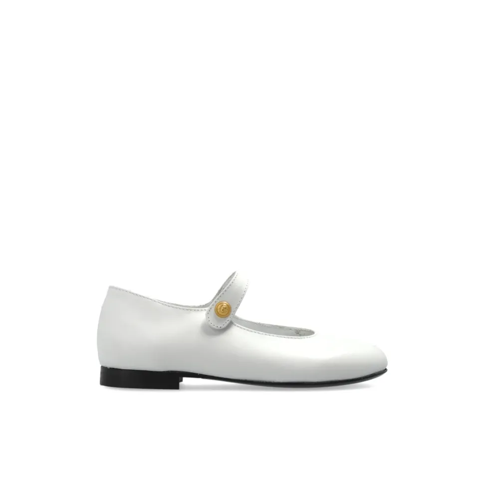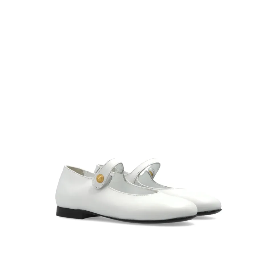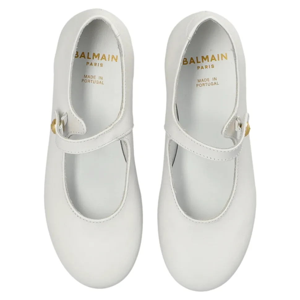Balmain Læder Ballerinaer er glatte, hvide læder Mary Jane sko med subtile guldaccenter og en indersål med logo, designet til et poleret, komfortabelt look ved særlige lejligheder. Vigtige egenskaber: Hvid | Læder | Blødt læderfor for komfort | Slidstærk gummiydersål for godt greb | Komfort hele dagen | Mary Jane rem med knaplukning | Rund snude | Subtil Mary Jane rem med guld ‘B’ knap | Guld “BALMAIN PARIS” print på indersålen | Dimensioner & pasform: Sålhøjde (højeste punkt): 1,5 cm | Sammensætning & pleje: Læder (overdel) | Læderfor og indersål | Gummiydersål