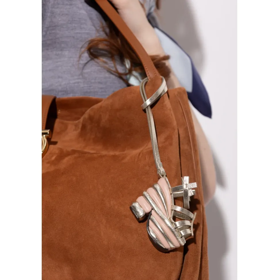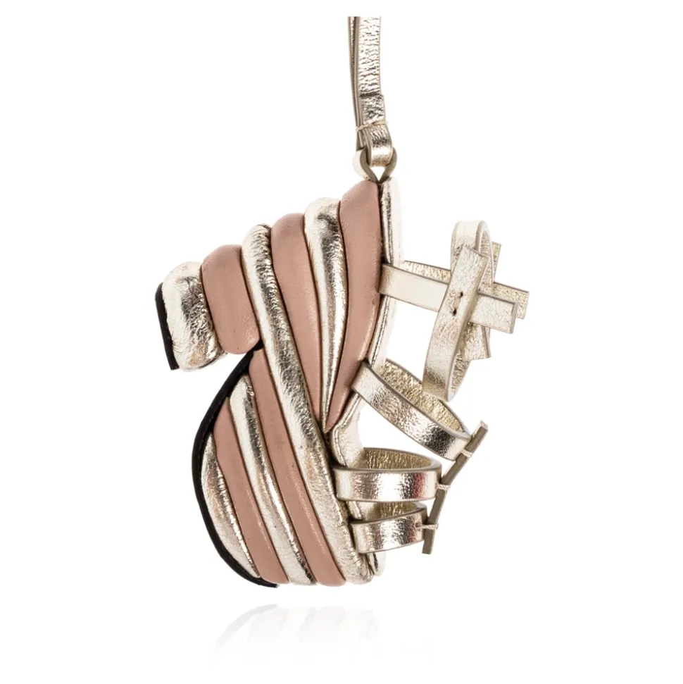 Ferragamo Læder Sko-Formet Vedhæng er en skulpturel taskevedhæng, der skiller sig ud med sin miniature højhælede silhuet og raffinerede læderdetaljer, designet til at hænge fra tasker eller tilbehør med en slank metallisk rem. Nøgleattributter: Gul | Guld | Læder | Tynd guldrem til ophængning | Abstrakt miniature højhælet skoform | Skiftende guld- og lyserøde/beige læderstriber | Dekorativ snoet øvre detalje | Intet synligt logo for et minimalistisk look | Sammensætning & pleje: Læder