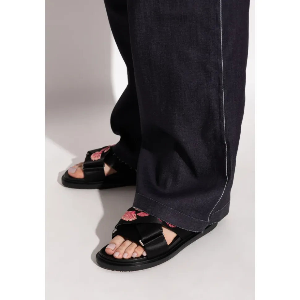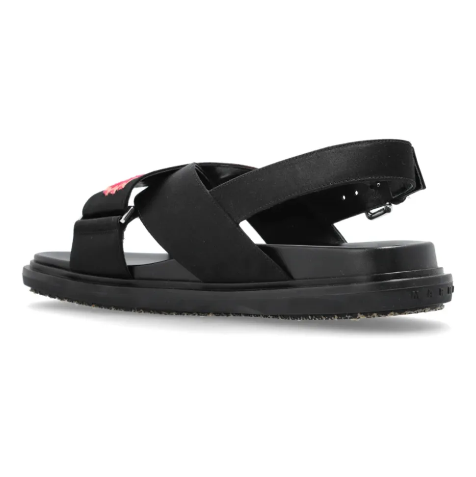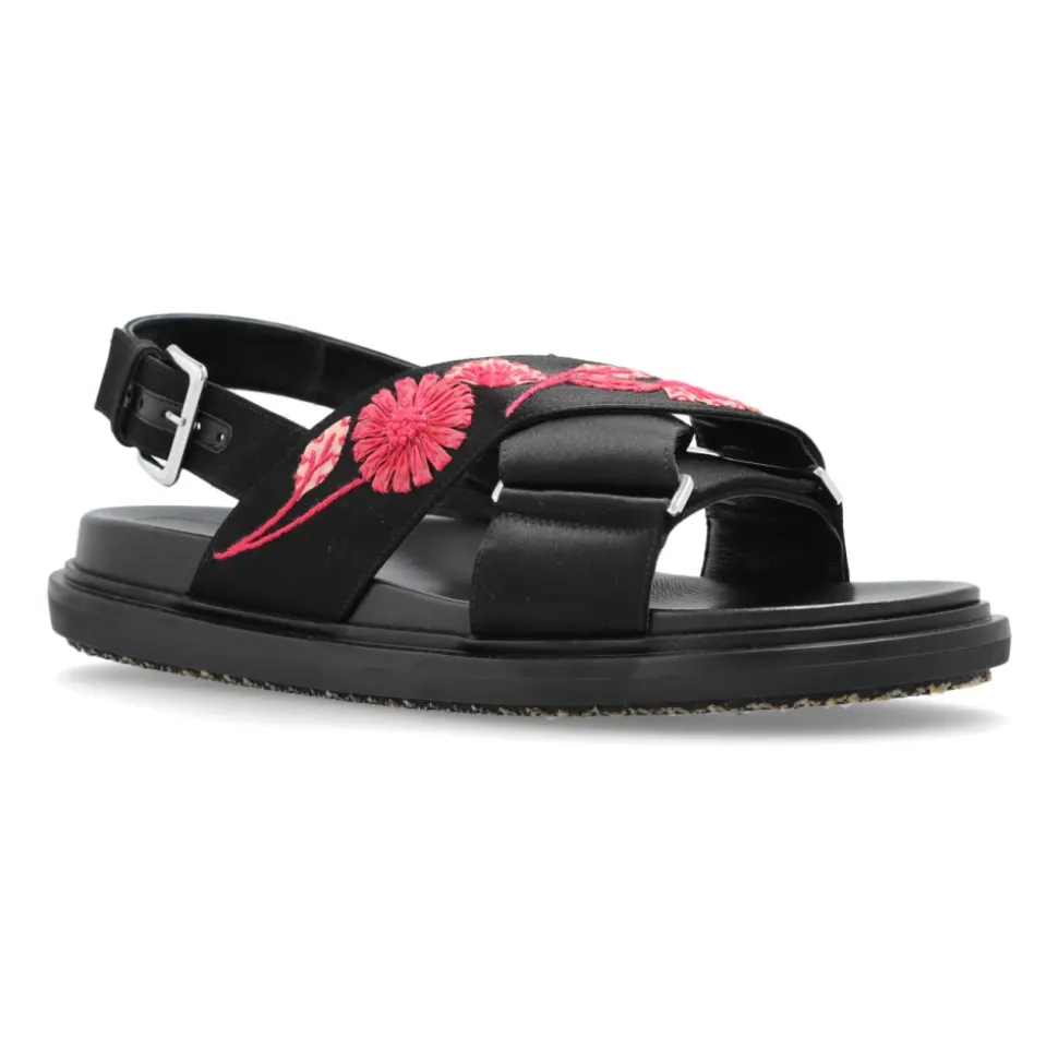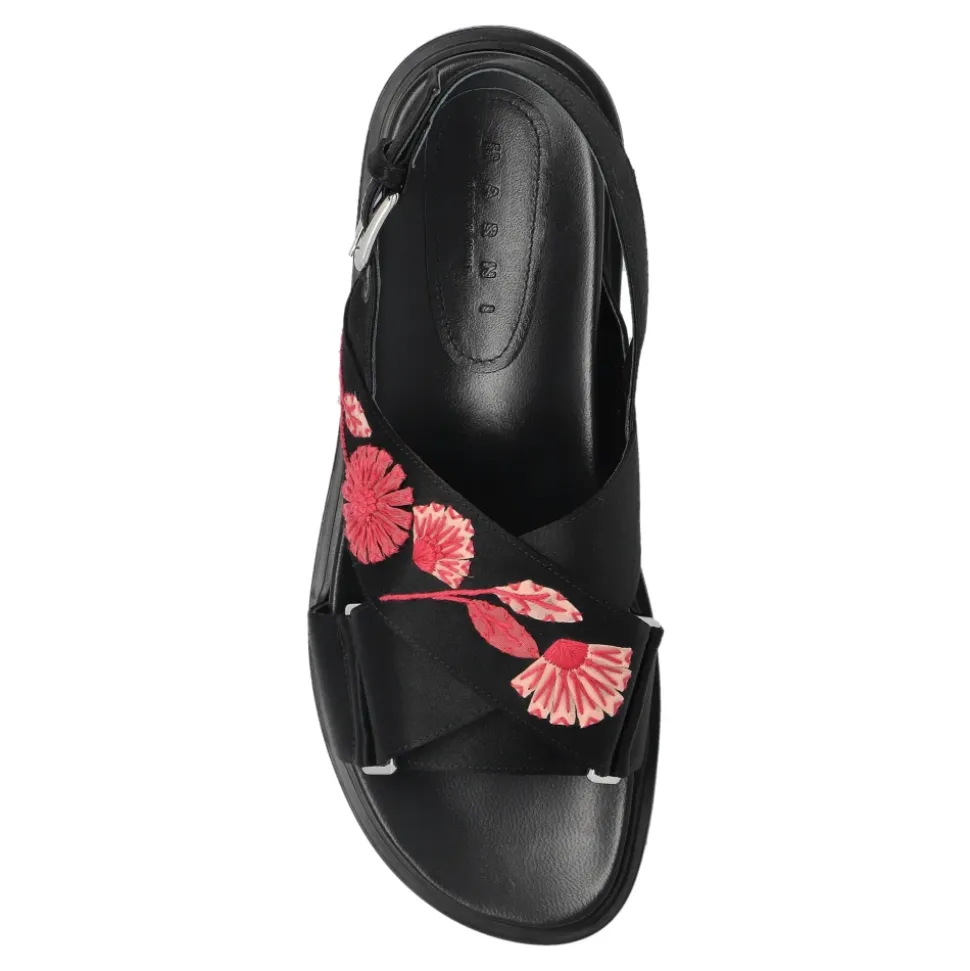 Opdag tidløs ELEGANCE udtrykt af Marnis eksklusive damesandaler. Denne model fanger med ÆDLEHEDEN AF ÆGTE LÆDER og en klassisk silhuet, der har brede remme, der diskret krydser foran for at skabe en harmonisk helhed. Den stabile spænde-fastgjorte hælrem og bløde læderindersål, prydet med designerens delikate logo, forbedrer komforten ved at have dem på. Sandalernes raffinerede karakter understreges yderligere af et OMHYGGELIGT UDARBEJDET, BRODERET BLOMSTMOTIV på en af de forreste remme – røde og pink blomster oplyst med hvid bringer en kunstnerisk flair. Hvert detalje afspejler det italienske håndværksmesterskab og Marnis enestående opmærksomhed på detaljer. HVORFOR SKAL DU KØBE DETTE PRODUKT? * Det intrikat broderede blomstmotiv fanger øjet og tilføjer sofistikering. * Ægte læder sikrer holdbarhed og bærekomfort. * Stabilitet takket være den behagelige hælrem. * Italiensk design og Marnis unikke stil. * Det subtile logo forbedrer fodtøjets eksklusive karakter. Sål højde: 2cm Sål højde på det højeste punkt: 2,5cm