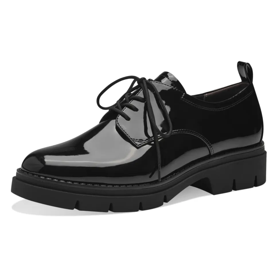 Træd selvsikkert ud i Tamaris` Lak Lædersko med Snørebånd, designet i elegant sort lak for et poleret look. Disse flade sko har snørebånd og en robust ydersål, der sikrer både stil og komfort. Produkt detaljer: Sort | Lak | Robust ydersål | Snørebåndsdesign | Dimensioner og pasform: Normal pasform | Sammensætning og pleje: Aftørres med en fugtig klud.