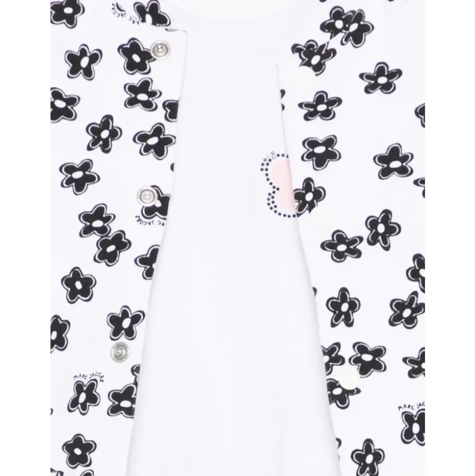 Marc Jacobs langærmet jakke, T-shirt og leggings sæt kombinerer en jakke med mandarin-krave med en grafisk T-shirt og leggings med elastik i taljen for et koordineret hverdagslook. Vigtigste egenskaber: Hvid | Sort | Pink | Bomuld | Logo trykknaplukning på jakken | Trykknaplukning bagpå T-shirten | Elastik i taljen på leggings | Langærmet jakke | Mandarin-krave | All-over sort blomsterprint på jakken | Kortærmet T-shirt med pink blomst og glitterdetalje | Lange leggings | Sammensætning og pleje: 100% bomuld