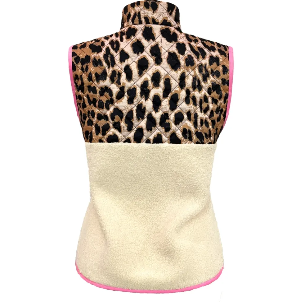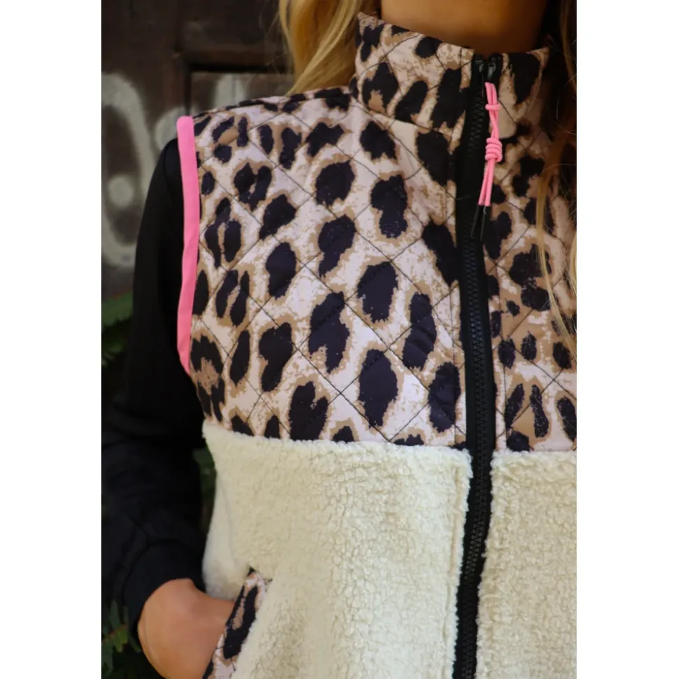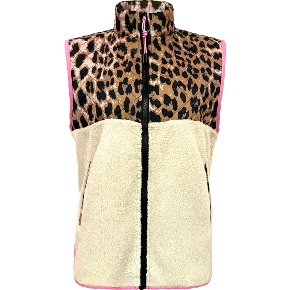 Forøg din stil med Liberté – Teddy Leo Vest til kvinder. Denne smarte vest har en smuk kombination af quiltet beige stof med et leopardmønster i sorte og brune nuancer øverst og råhvid teddy stof med leoparddetaljer forneden. Den er accentueret med lyserød kant for et stilfuldt touch. Vesten har en høj hals, to åbne forlommer og lukkes foran med lynlås. Pasform: Normal / Rummelig. Materiale: 100% polyester. Pleje: Maskinvask ved 30 grader. Husk at følge vaskeanvisningerne. Style nr.: 22173_Big Lux Leo.