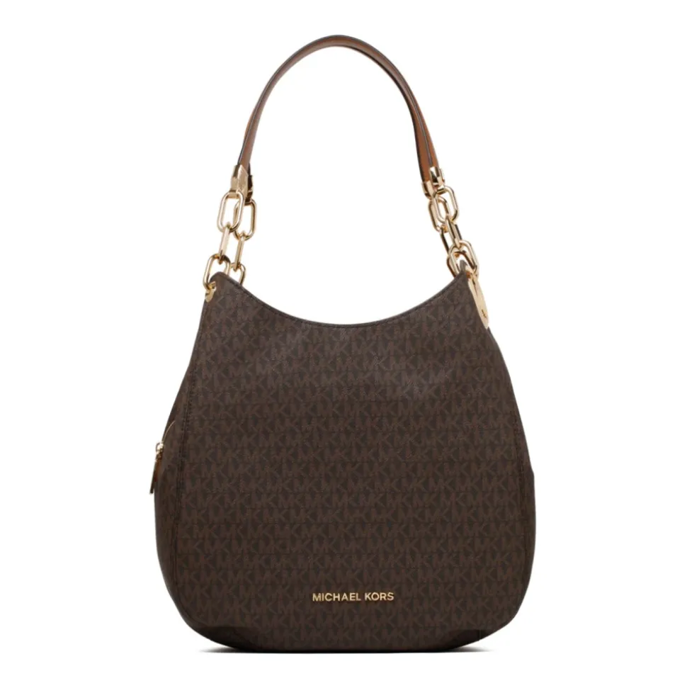 Løft din stil med Michael Kors Lilie Large Skuldertaske. Denne rummelige brune skuldertaske har et elegant monogramprint og en guldfarvet logo-plakette, perfekt til både afslappede udflugter og formelle begivenheder. Produkt detaljer: Brun | Magnetisk lukning | Indvendig lynlåslomme | Baglomme | Chic monogramprint | Guldfarvet logo-plakette | Dimensioner og pasform: 31,7 cm x 34,3 cm x 12,7 cm |