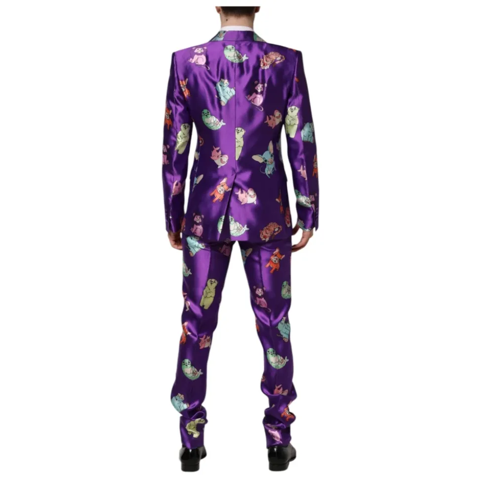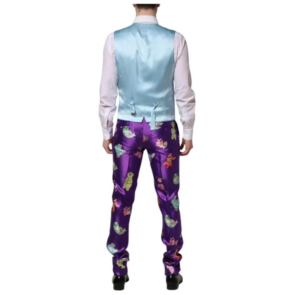 Forkæl din garderobe med denne fantastiske Dolce & Gabbana 3-delt dragt i lilla med et flerfarvet dyreprint. Fremstillet i Italien med 100% silke, denne slim fit dragt har en to-knaps lukning, indvendige lommer og en enkelt slids bagpå. Sættet inkluderer en blazer, bukser og en vest med logo detaljer, hvilket gør det til et virkelig eksklusivt stykke håndværk.