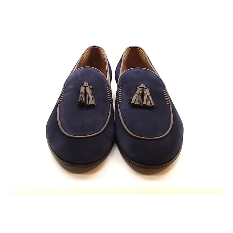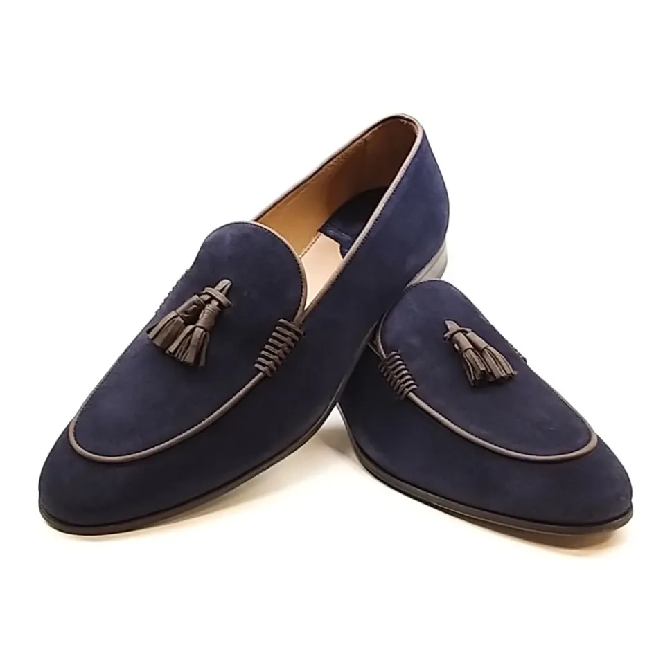 Opgrader dit afslappede look med disse marineblå ruskindsmokkasiner fra Lottusse. Med en kontrasterende læderkant og tassels på vristen tilbyder disse mokkasiner et ungdommeligt og sofistikeret touch. Den tynde gummisål giver komfort og stil.