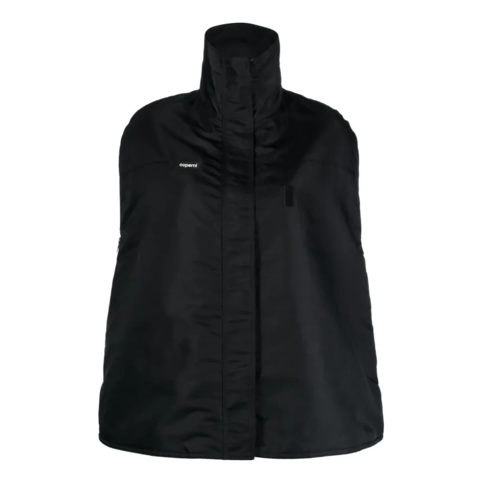 Hold dig stilfuld og beskyttet med Logo-Patch Bomber Cape fra Coperni. Denne sorte cape har et logo-patch på brystet, en tragthals og en skjult frontlukning, hvilket gør den både funktionel og moderigtig. Produkt detaljer: Sort | Polyamid | Skjult frontlukning | To sidelommer med lynlås | Tragthals | Lige kant | Dimensioner og pasform: Passer normal i størrelsen | Sammensætning og pleje: 100% Polyamid