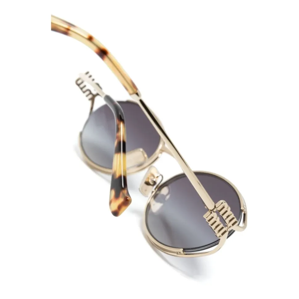 Forkæl dig selv med disse Miu Miu solbriller, der har en guldbelagt metalramme og ovale gråtonede linser. Tempelstykkerne viser det ikoniske logo, og stellet er kompatibelt med graduerede linser. Beskyt dig med 100% UVA- og UVB-beskyttelse og nyd de justerbare næsepuder for en behagelig pasform. Linsebredde: 54 mm; Næsebroens længde: 21 mm; Tempellængde: 125 mm.