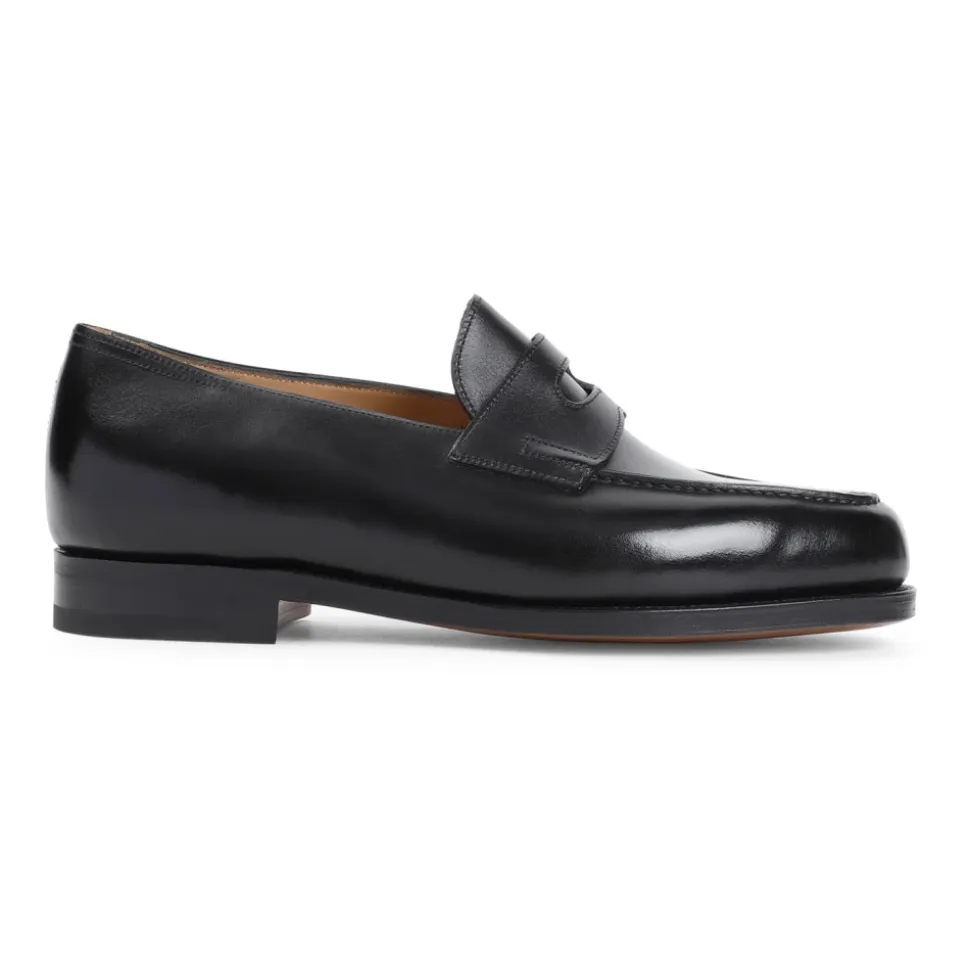 John Lobb Lopez Loafers kombinerer klassisk penny-loafer-styling med raffineret kalveskindskonstruktion og tilbyder en lav, stablet hæl for diskret hverdags elegance. Vigtige egenskaber: Sort | Kalveskind | Slip-on design | Brandet læder indersål | Mandelformet tå | Penny strop | Håndsyet forklæde | Lav stablet hæl | Dimensioner & pasform: Hælhøjde: 2,5 cm | Sammensætning & pleje: Kalveskind (overdel) | Læderforing | Lædersål