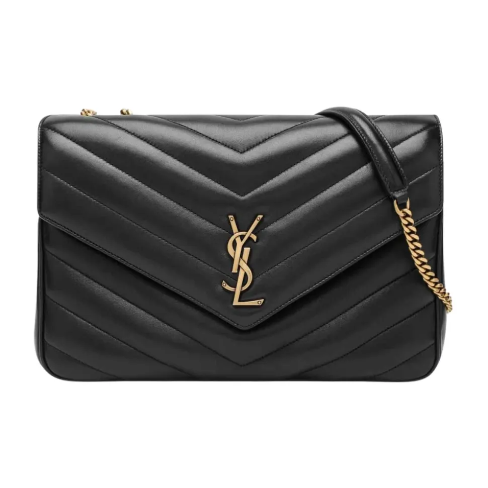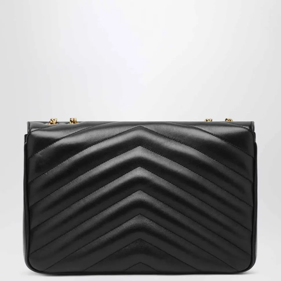 Saint Laurent Loulou Large Bag – en matelassé lammeskindstaske med chevron-quiltede syninger og en justerbar kæderem, designet til alsidig brug fra dag til aften. Vigtigste egenskaber: Sort | Lammeskind | Justerbar kædeskulderrem (kan bæres over skulderen eller crossbody) | Aftagelig læderpung | Magnetisk trykknaplukning | Indvendig flad lomme | Lommespejl | Chevron-quiltede (matelassé) syninger | Frontklap med magnetisk lukning | Cassandre-bogstavlogo | Polstret topstikning | Mål og pasform: B 32 cm x H 22 cm x D 10 cm | One size | Sammensætning og pleje: Ydre: 100% lammeskind | Foring: 100% grosgrain (stof) | Hardware: Messing | Rengør med en blød klud.