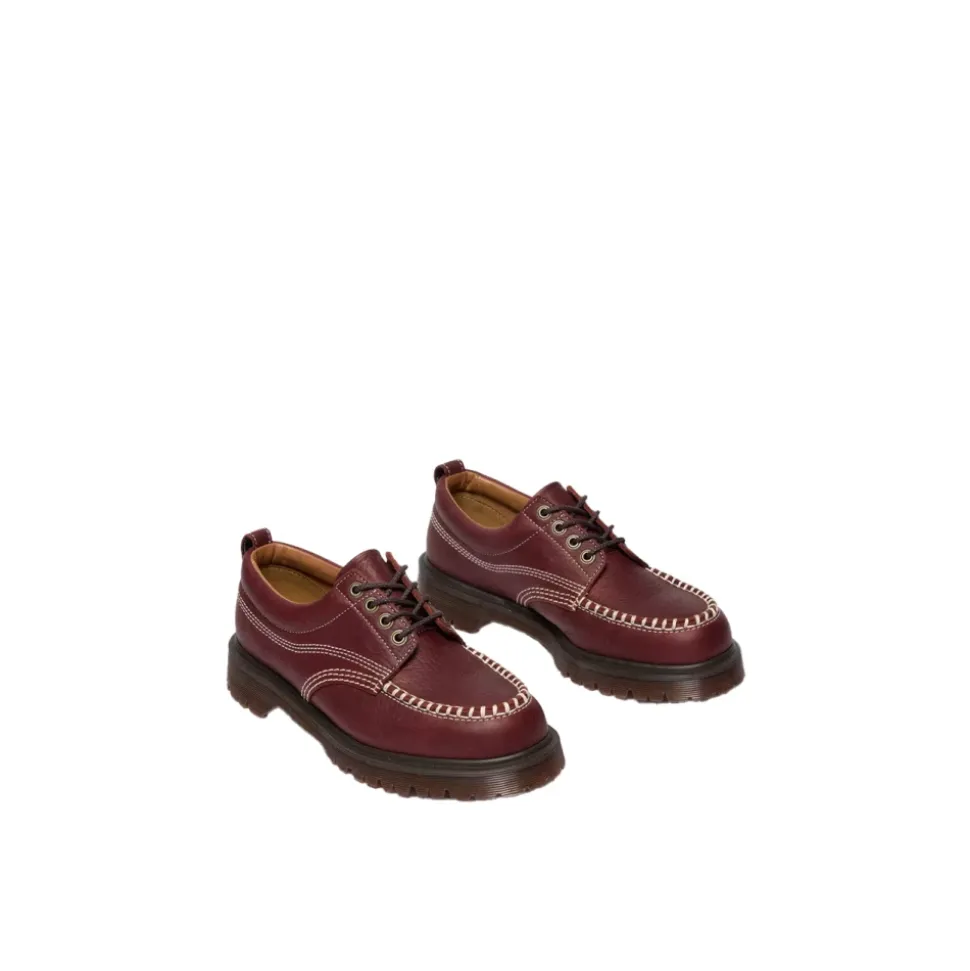 Dr. Martens Lowell 4-Eye Shoe opdaterer en arbejdstøjsinspireret moc toe med en ren fire-øje silhuet og en polstret krave for ekstra komfort. Den rødbrune russet wild grain læderoverdel og kontrasterende ecru syninger giver et karakteristisk, tekstureret look. Vigtige egenskaber: Rød | Wild Grain læder | Goodyear-welted konstruktion (termo-welted og syet overdel og sål) | Polstret krave | Moc toe | Fire-øje snøring | Tekstureret wild grain finish | Kontrasterende ecru syninger | Sammensætning & pleje: 100% Wild Grain læder