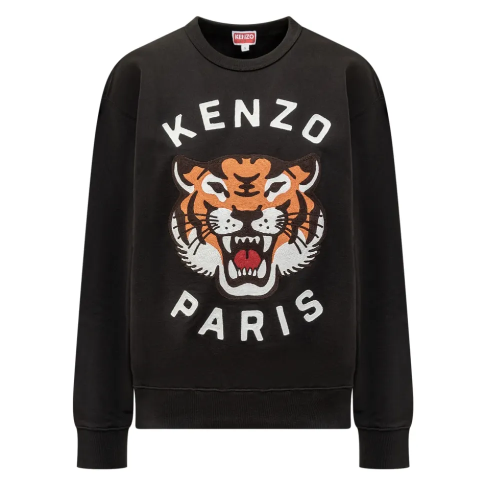 Kenzo Lucky Tiger Oversize Sweat leverer en afslappet sweatshirt, der er klar til garderoben, med et iøjnefaldende broderet Tiger-motiv. Den er designet til hverdagsbrug og kombinerer afslappet komfort med detaljeret kædestingsbroderi på forsiden. Vigtige egenskaber: Sort | Bomuld | Rund hals | Lange ærmer | Ribkant | Ribmanchetter | Broderet Kenzo Tiger-logo på forsiden | Kædestingsbroderi | Sammensætning og pleje: 100% bomuld