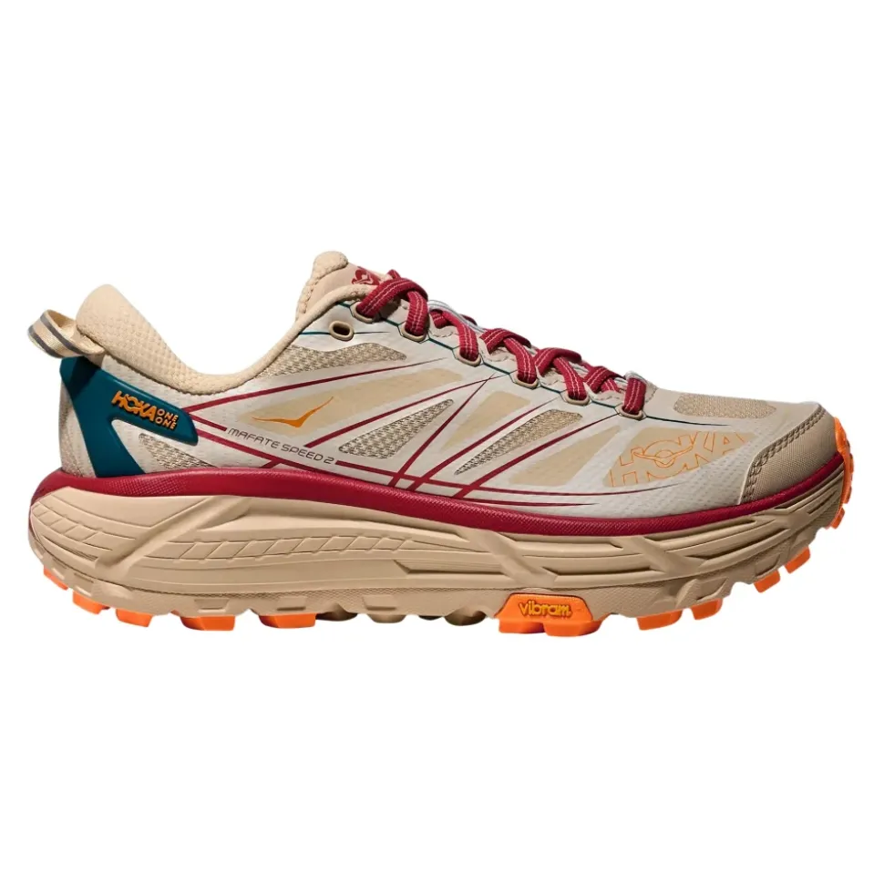 Hoka One One Mafate Speed 2 er en trail-løbesko, der kombinerer responsiv stødabsorbering med aggressiv Vibram-trækkraft til teknisk terræn og hverdagsbrug. Vigtige egenskaber: Beige | Neutrale | Stof | Vibram MegaGrip-ydersål for trækkraft | CMEVA-mellemsålsstødabsorbering | Meta-Rocker-geometri i tidligt stadie for jævne overgange | Let, støttende konstruktion | Snørelukning | Ekstern monomesh-beskyttelsesskærm | Lav silhuet | No-sew SpeedFrame-konstruktion | Skulptureret svangstøtte | Dimensioner & pasform: Lille i størrelsen – overvej at bestille en størrelse større. | Sammensætning & pleje: Overdel i stof | For i stof | CMEVA-mellemsål | Ydersål i gummi (Vibram MegaGrip)