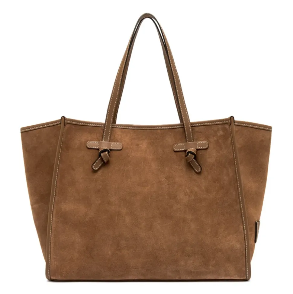 Gianni Chiarini Marcella Tote Bag er en ruskindstaske, der kombinerer en minimalistisk silhuet med praktiske detaljer til hverdagsbrug. Dens ruskindskrop, læderhanke og magnetlukning gør den til en elegant, men funktionel ledsager til daglige gøremål og arbejde. Vigtigste egenskaber: Brun | Ruskind | Magnetlukning | Læderhanke | Indvendig foring | Matchende aftagelig læderpung | Tone-i-tone trim | Minimalistisk silhuet | Rektangulær form | Dobbelte hanke | Dimensioner og pasform: 38x31x16 cm | One size | Sammensætning og pleje: 100% læder