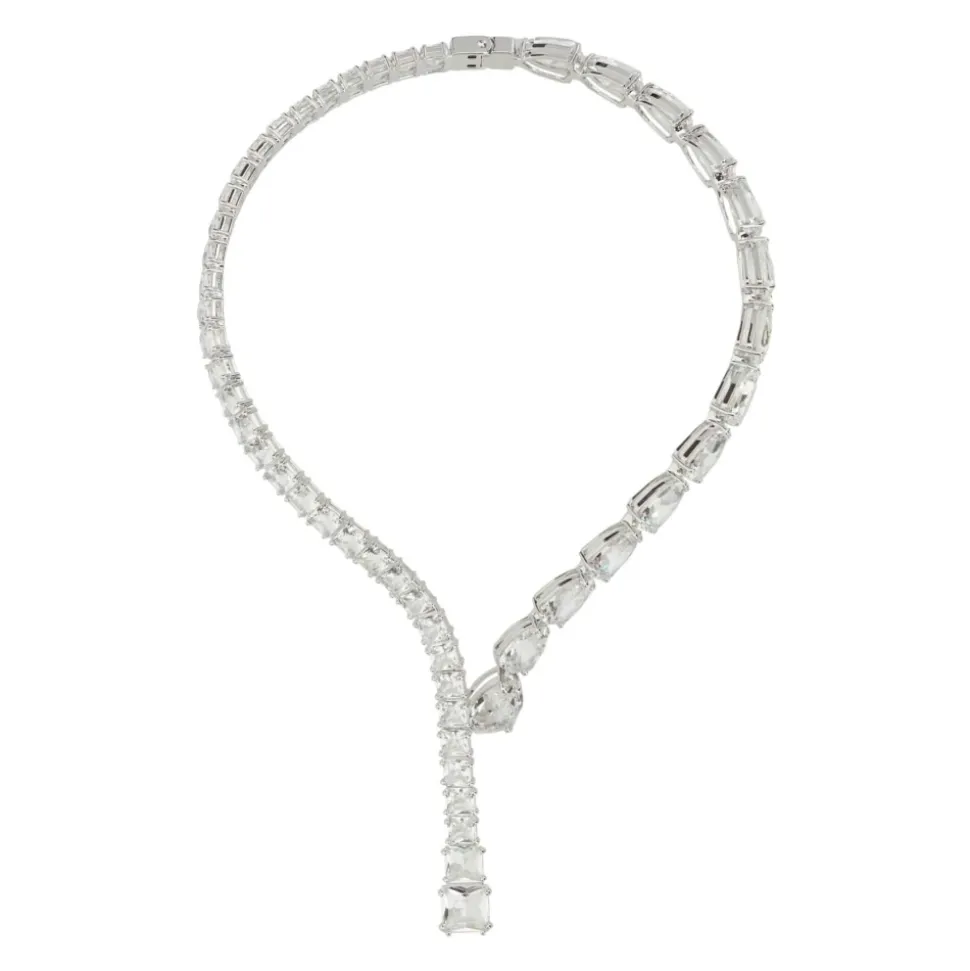 Swarovski Matrix Open Halskæde kombinerer blandede klare krystaller med en rhodiumbelagt metalramme for at skabe et skulpturelt statement-smykke, der er ideelt til aftenbrug og særlige lejligheder. Vigtigste egenskaber: Grå | Sølv | Krystaller, Rhodiumbelagt metal | Fjederhængslelås | Åbent frontdesign | Blandede klare krystaller (pære- og firkantsnit) | Rhodiumbelagt finish | Motiv 5,7 x 3,1 cm | Dimensioner og pasform: Omkreds: 33 cm | Motivstørrelse: 5,7 x 3,1 cm | Sammensætning og pleje: Krystaller | Rhodiumbelagt metal | Rengør med en blød, tør klud; undgå kontakt med vand, parfume og kemikalier; opbevar i en tør, foret æske.