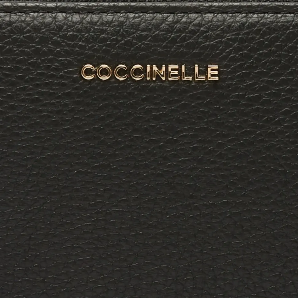Coccinelle Metallic Large er en rummelig lynlåspung fra Metallic-linjen, afsluttet med et Coccinelle-logo i metal og designet til pæn opbevaring hver dag. Den giver organiseret plads til kort, mønter og sedler i en kompakt silhuet, der er let at bære. Vigtige egenskaber: Sort | Kornet læder | Lynlåslukning | Indvendig møntlomme med lynlås | 12 kortpladser | Seks indvendige rum | Organiseret indvendig layout | Metal logo detaljer | Kornet læderfinish | Lynlåspung silhuet | Mål og pasform: 19×11 cm – 210 g | Sammensætning og pleje: 100% okselæder