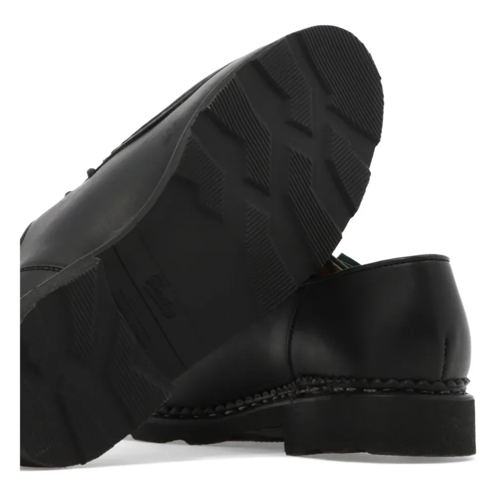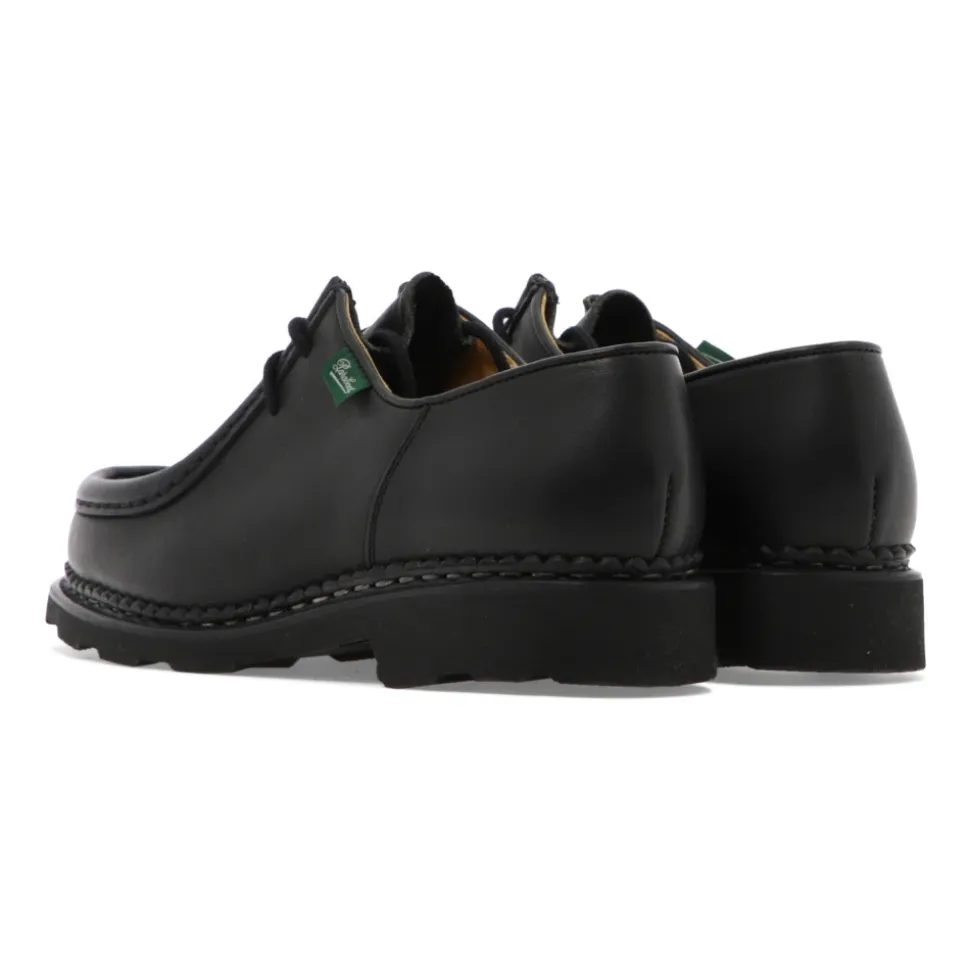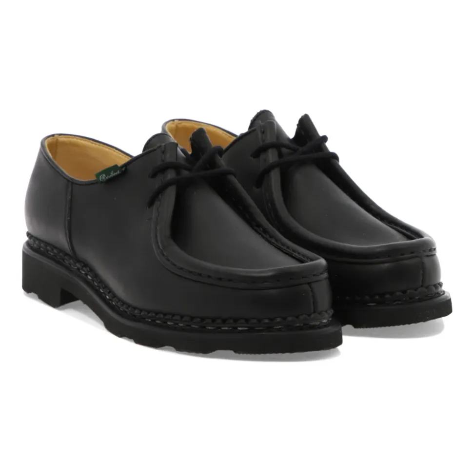 Paraboot Michael Griff bringer klassisk norsk randsyning til en mokkasin med snørebånd. Skoen kombinerer en overdel i kalvelæder og læderforing med en naturgummisål for alsidig brug fra formelle lejligheder til hverdagsbrug. Vigtige egenskaber: Sort | Kalvelæder | Naturgummisål | Holdbar konstruktion | Læderforing | Snørelukning | Kan omformes | Moc-toe (mokkasintå) | Norsk randsyning | Afrundet tå | To-øje snøring | Sammensætning & pleje: Kalvelæder overdel | Læderforing | Naturgummisål | Rengør med en blød børste. Påfør lædercreme eller voks jævnt, og polér derefter for at skinne. Brug neutral polish på randsyede sømme for at beskytte syningerne.