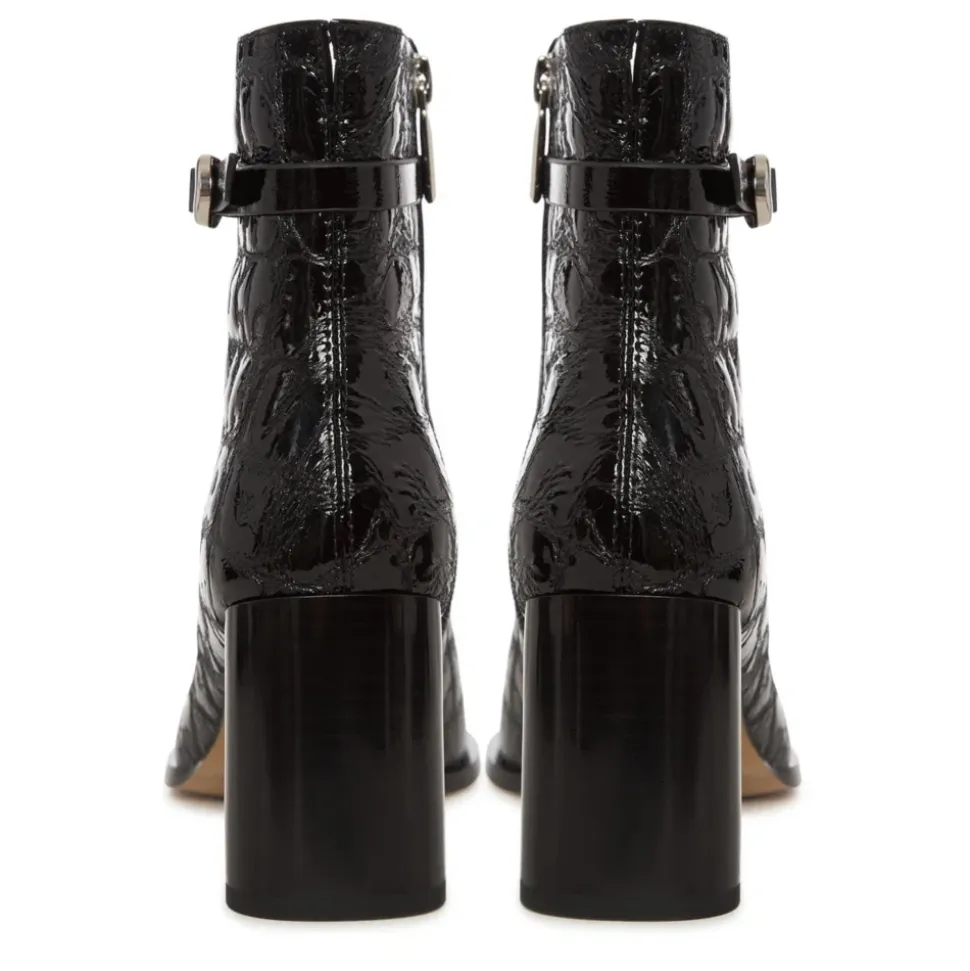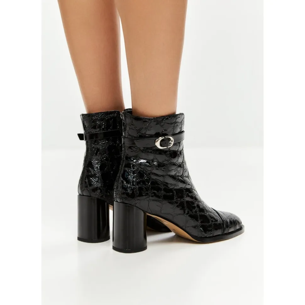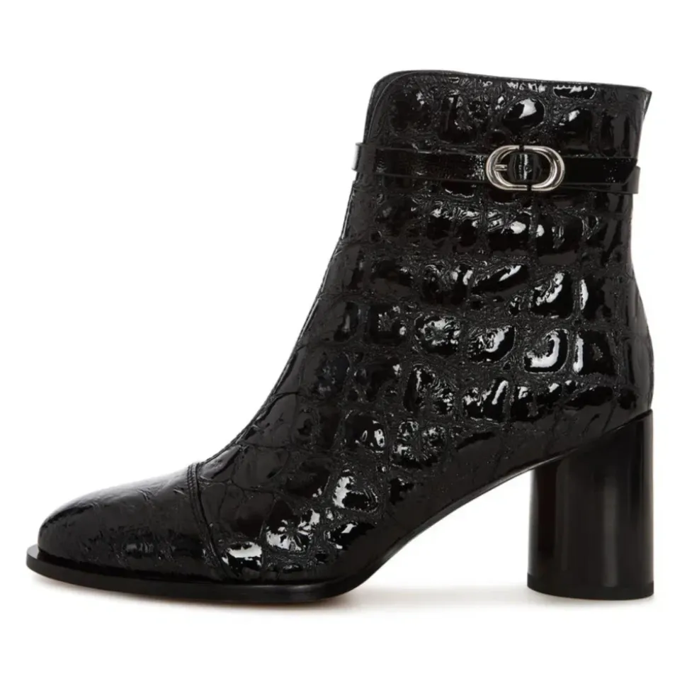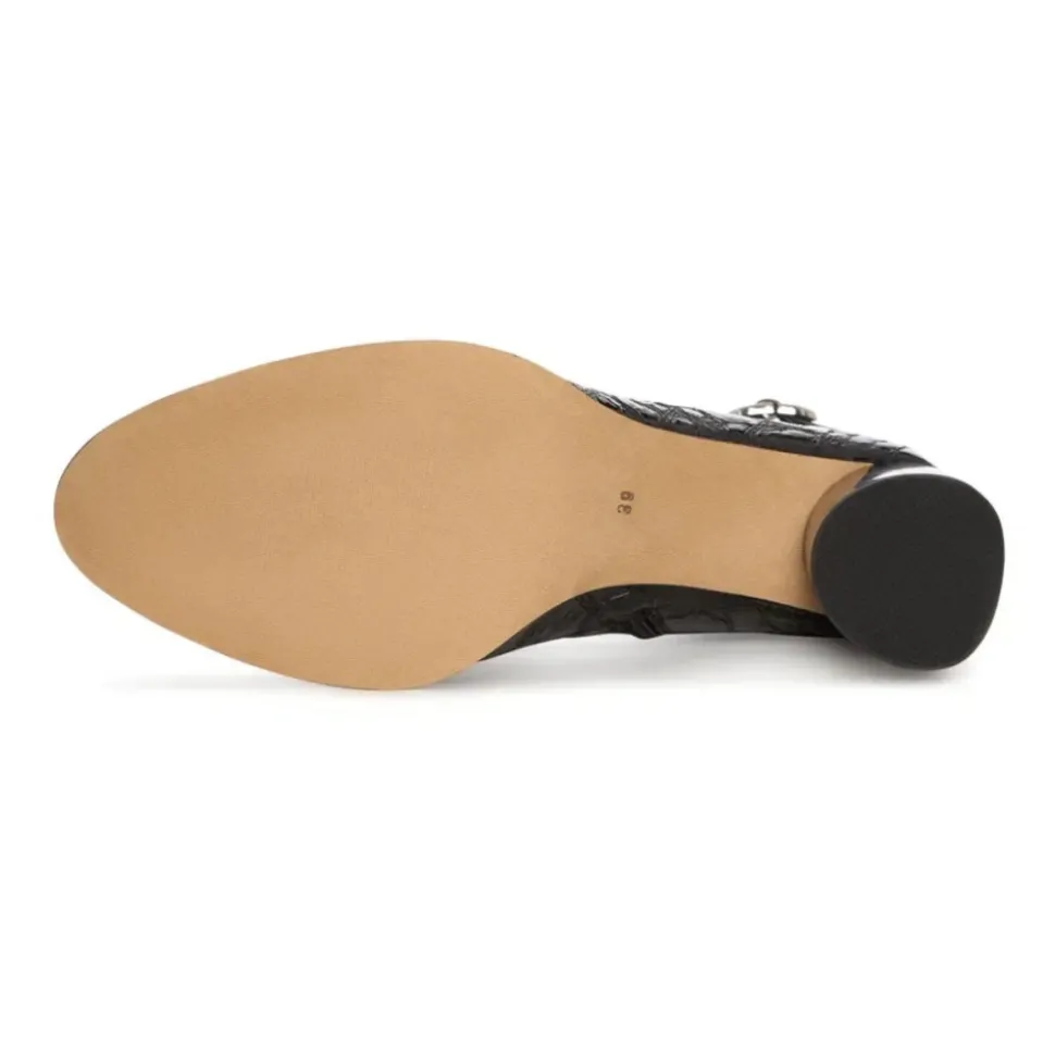 Udlev elegant sofistikation med Midnight Croc Block Boots. Med en slående præget tekstur og en moderne spænde detalje er disse ankelstøvler et go-to valg til kantet forfinelse og dag-til-aften overgange. Materiale: Læder Foring: Læderforing Polstringstype: Kold polstring Skospids: Mandel tå Lukning: Lynlås i siden Sål: Gummisål Detaljer: Krokopræget tekstur, metallisk spænde, blank finish Hæltype: Blokhæl Hælhøjde: 9 cm Plateauhøjde: n/a Skafthøjde: n/a Skofit: Almindelig Vedligeholdelsesinstruktioner: Undgå at placere læderet i direkte sollys eller ekstrem varme. Rengør med skum fra sæbeflager til husrengøring. Undgå at læderet bliver gennemblødt eller kommer i kontakt med skarpe genstande. Ved spild skal det straks absorberes med en ren, tør klud.