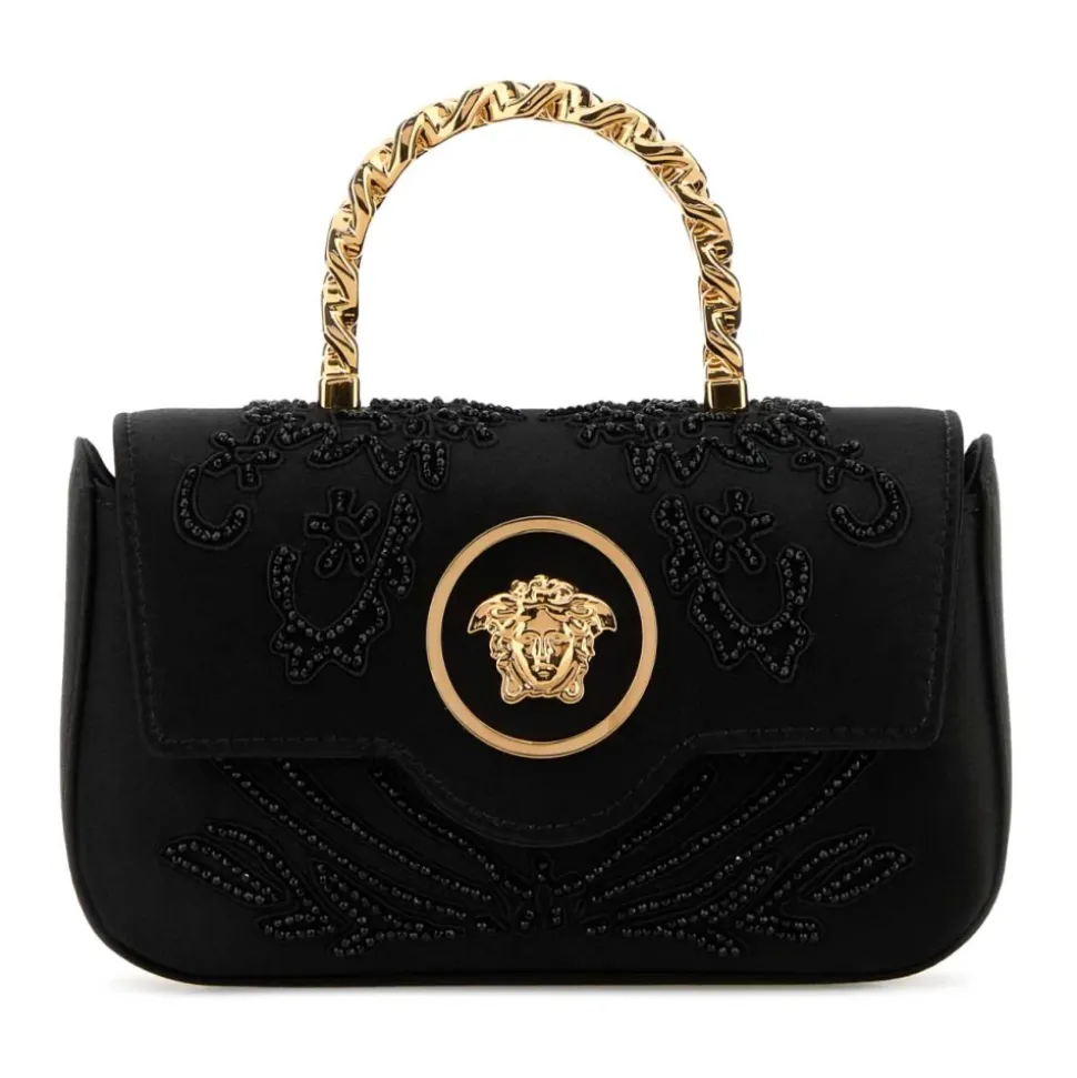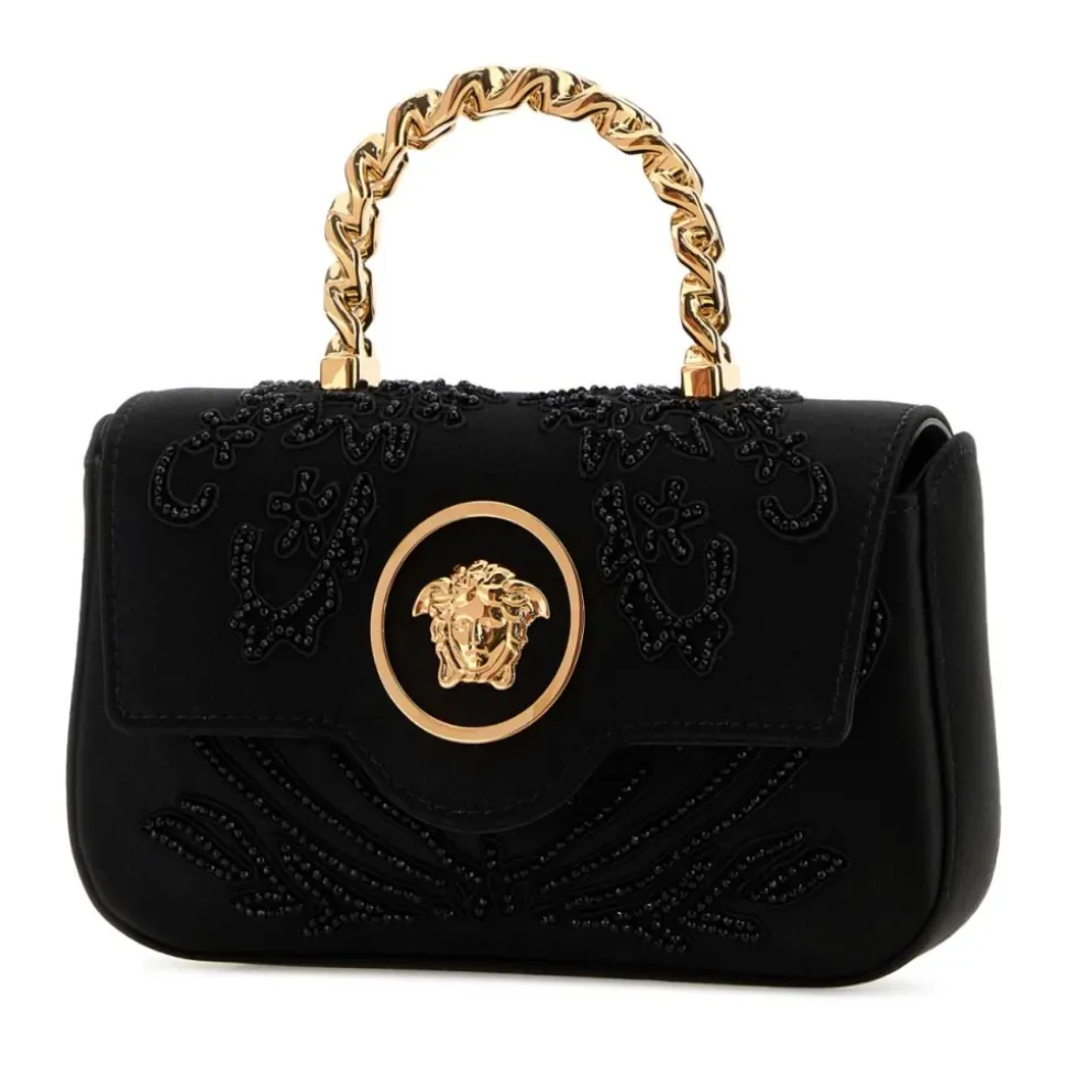 Versace Mini Top Handle Vitello er en kompakt lædertop-håndtaske designet til brug fra dag til aften. Den skiller sig ud med sin strukturerede silhuet og signatur La Medusa hardware, plus en aftagelig rem for alsidig styling. Vigtige egenskaber: Sort | Kalveskind | Aftagelig skulderrem | Justerbar rem | Top håndtag | Magnetisk flaplukning | Indvendig slip lomme | Kortlommer | La Medusa hardware | Foldover flap | Kompakt silhuet | Sammensætning & pleje: 100% Kalveskind | Tørres af med en blød, tør klud og konsulter en læderspecialist for dyb rengøring eller reparationer.
