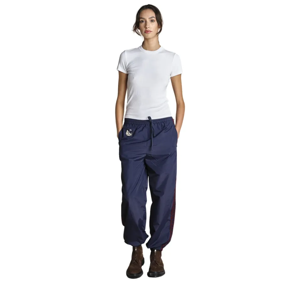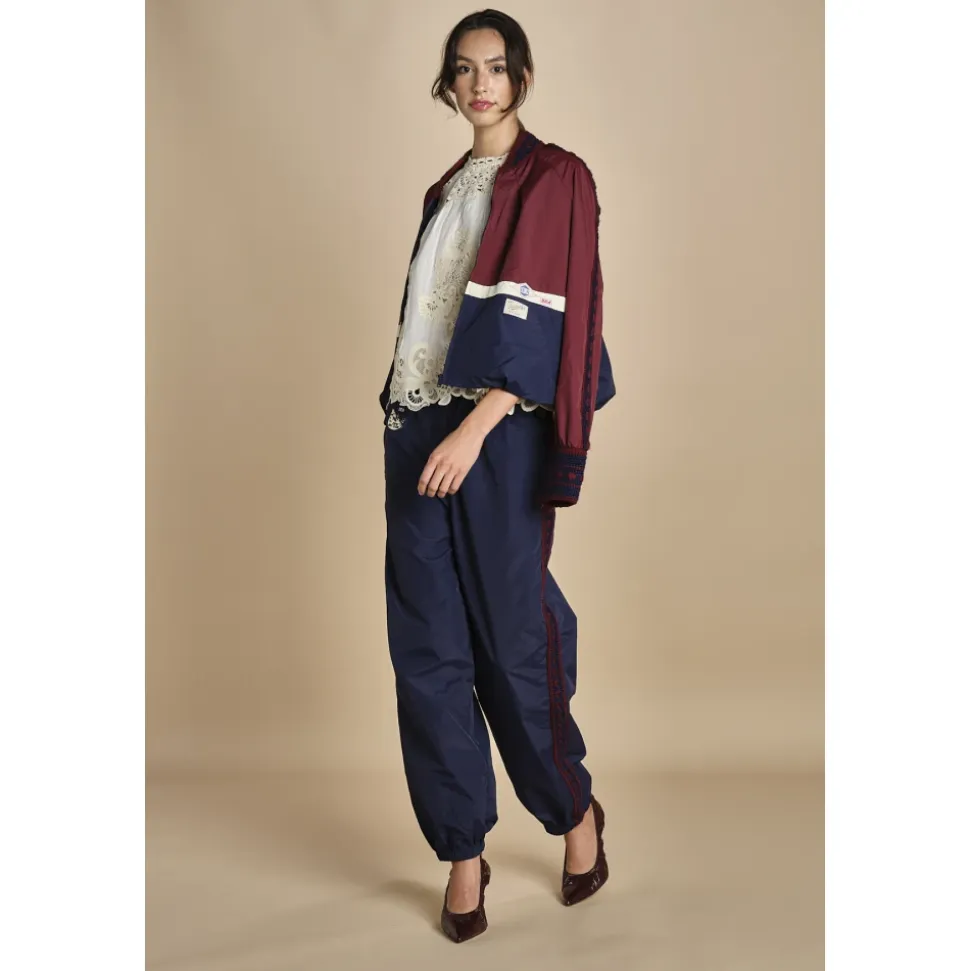 Sea NY Mira Pants er træningsbukser i windbreaker-stil, der kombinerer en afslappet silhuet med hæklede sidekanter og en elastisk talje med snøre. De er designet til let athleisure- og træningstøj. Vigtige egenskaber: Blå | Bordeaux | Nylon | Windbreaker-design | Elastisk talje med snøre | Slip-on | Hæklede kanter langs siderne | Custom ‘Sea’-patch | Dimensioner & pasform: Designet til en afslappet pasform | Modellen er 180 cm høj og bærer størrelse M | Sammensætning & pleje: Yderstof: 100% Nylon | Foring: 100% Bomuld | Dekoration: 50% Uld, 50% Akryl