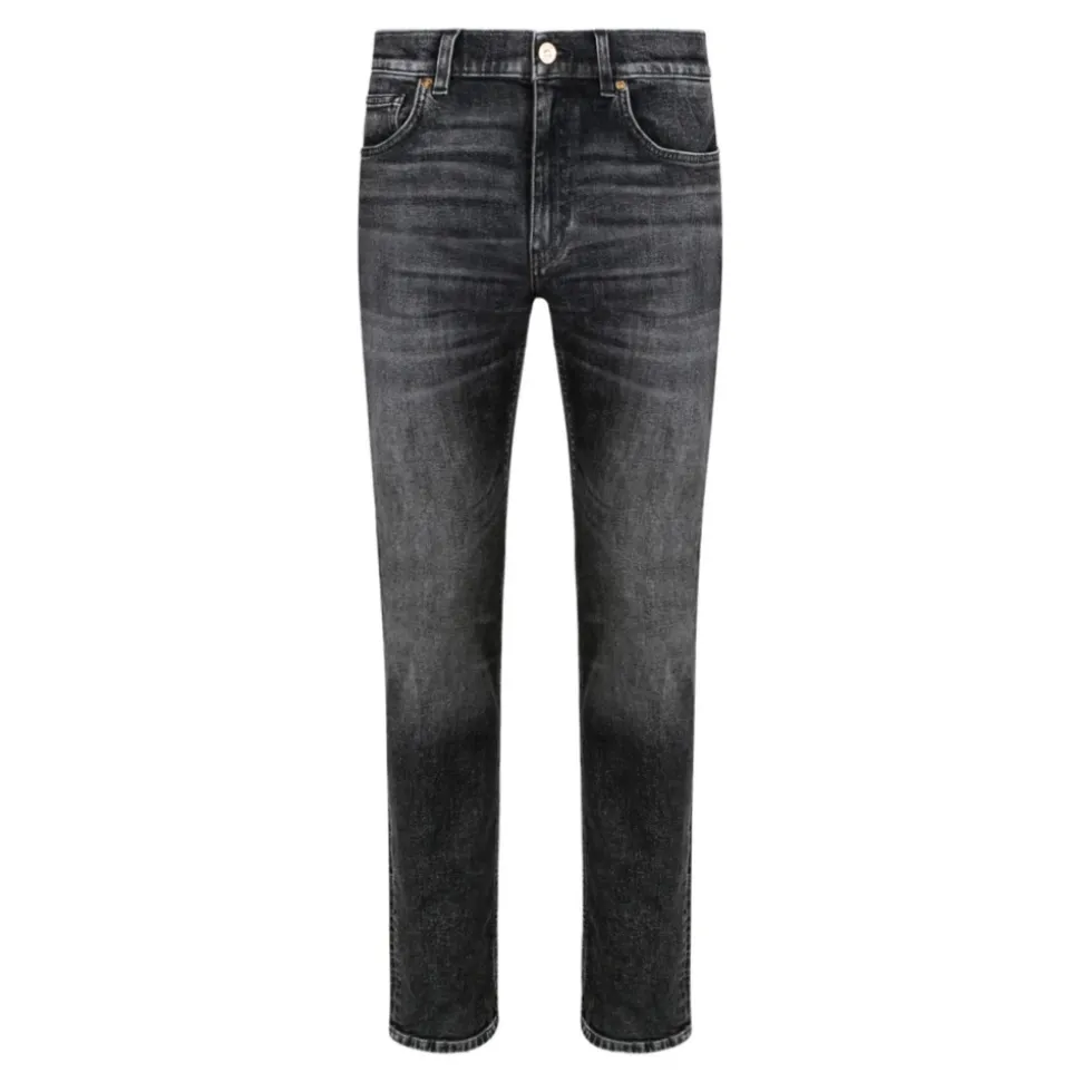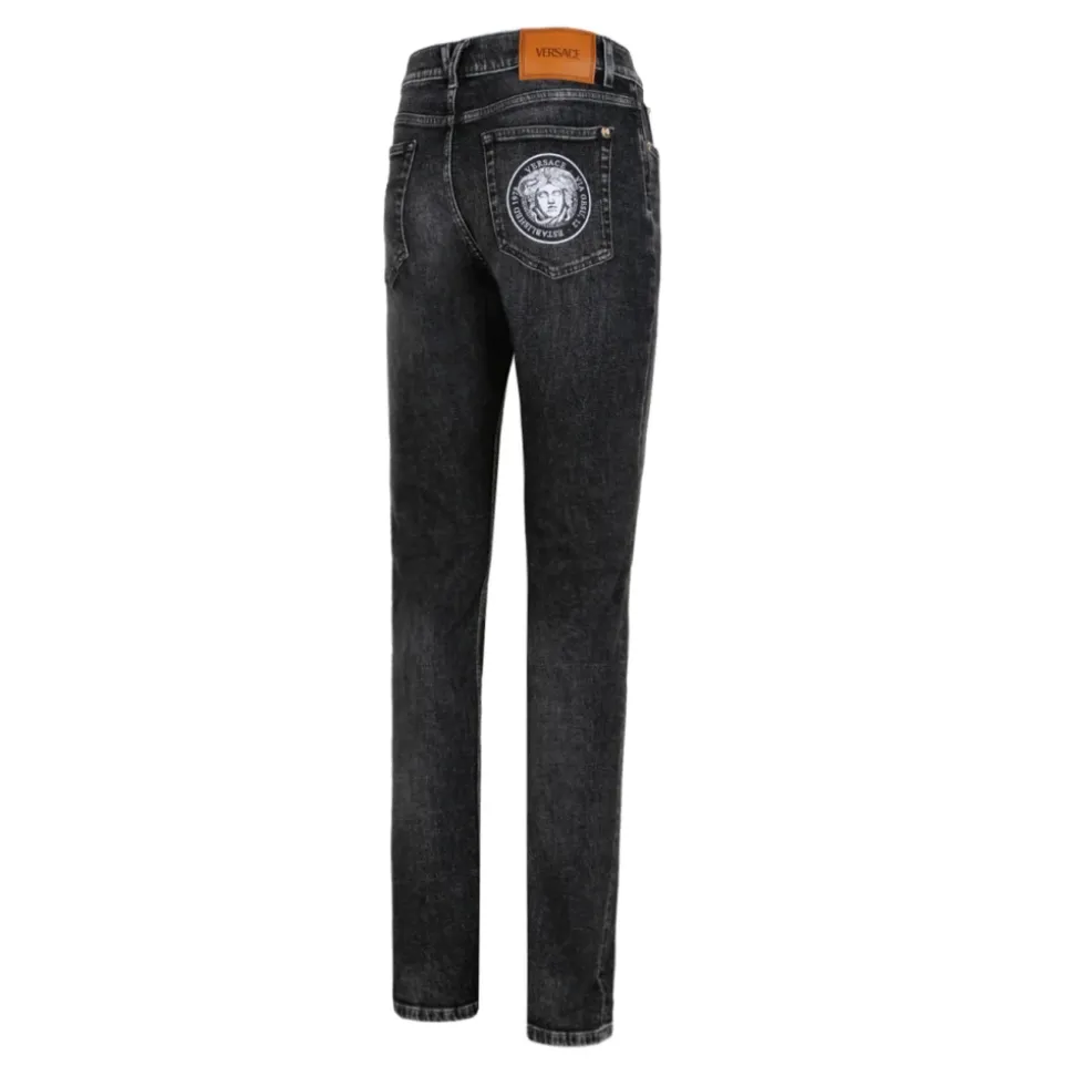 Fremhæv din stil med disse Versace Dark Grey La Medusa Broderi-Detalje Slim-fit Jeans til mænd. Med en mørkegrå farve og La Medusa broderidetalje, fem lommer, lynlås og knaplukning foran, bæltestropper og lige ben.