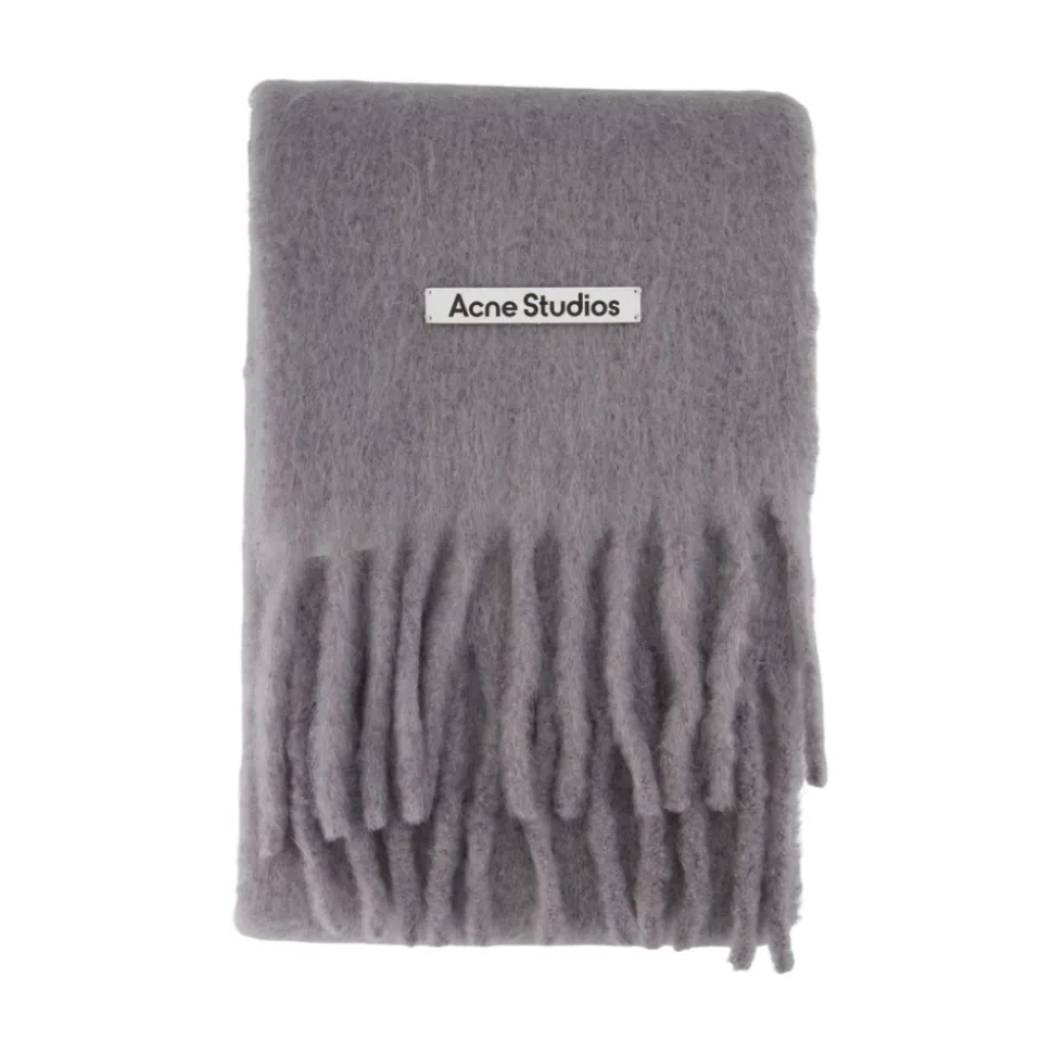 Acne Studios Mohair Logo Scarf er et blødt, varmt vintertilbehør fremstillet af mohair og afsluttet med frynser i enderne og en læderlogopatch for et raffineret look. Nøgleattributter: Grå | Mohair | Varmt isolerende tekstur | Blød, fuzzy håndfølelse | Læderlogomærke | Frynser i enderne | Børstet, håret tekstur | Dimensioner og pasform: Bredde: 23 cm | Længde: 220 cm | One size | Sammensætning og pleje: Skal: 91% Mohair, 9% Nylon | Patch: 100% Kalvelæder