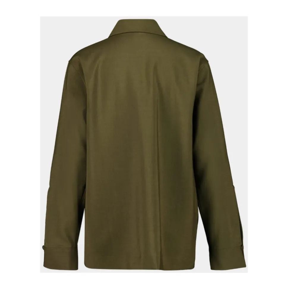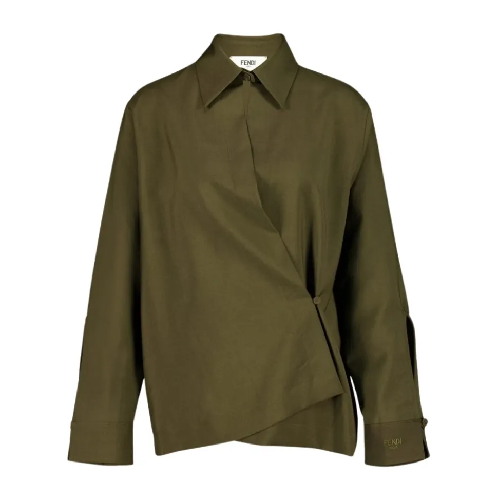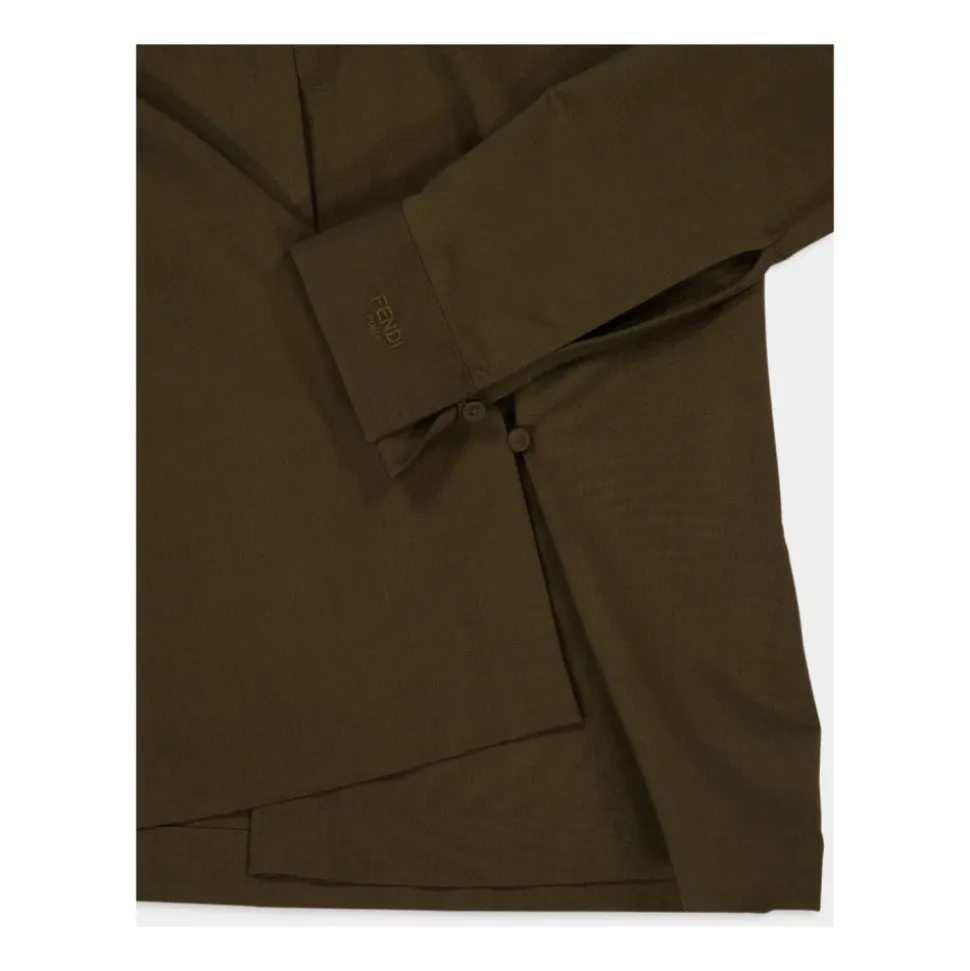 Fendi mohair- og uldskjorte kombinerer en crossover-silhuet med en asymmetrisk sideknaplukning for en elegant draperet effekt. En udskåret halsudskæring og broderet Fendi Roma-manchet giver den en moderne, karakteristisk finish. Nøgleattributter: Grøn | Olivengrøn | Uld og mohair | Asymmetrisk sideknaplukning | Brede manchetter med knapper | Crossover-silhuet | Skjortekrave | Udskåret halsudskæring | Draperet sidedetalje | Lange ærmer | Broderet Fendi Roma-logo på manchet | Sammensætning og pleje: 75 % uld | 25 % mohair | Foring: 100 % silke | Må kun renses