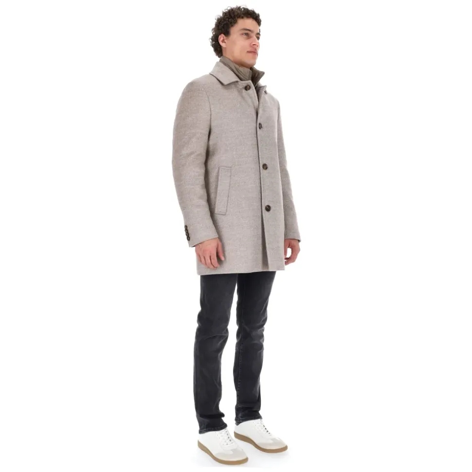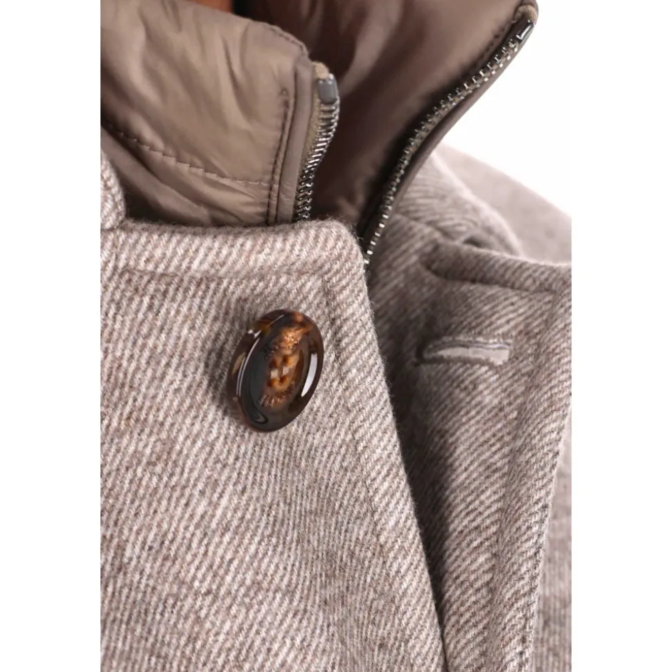 Moorer Monferrato-L Frakke kombinerer en ydre del af ren ny uld med dunfor, hvilket giver raffineret varme og garderobeklar beskyttelse til de køligere sæsoner. Nøgleegenskaber: Beige | Ren ny uld | Isolerende dunfor | Designet til efterår/vinterbrug | Enkeltknappet | Dunforet konstruktion | Sammensætning & pleje: 100% ren ny uld | For: Gåsedun | Kun kemisk rensning.