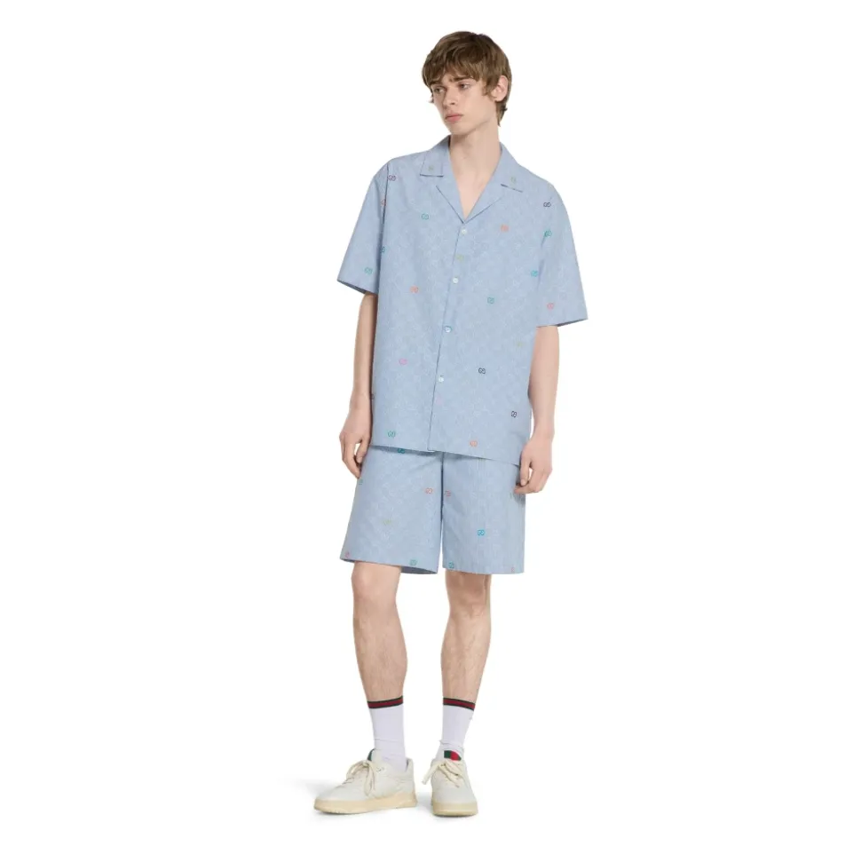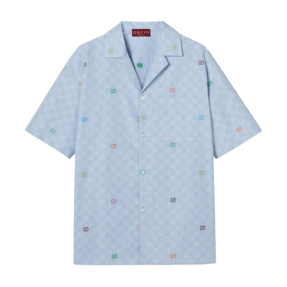 Gucci Multicoloured GG Stripe Shirt har brandets signatur GG fil coupé-mønster på en afslappet kortærmet silhuet, ideel til varmt vejr og afslappet styling. Vigtige egenskaber: Blå | Klar blå | Multicolor | bomuld | Brystlomme | Knaplukning | Notch-krave | Dropped shoulder | Korte ærmer | GG fil coupé-mønster | Sideslidser | Sammensætning & pleje: 100% bomuld