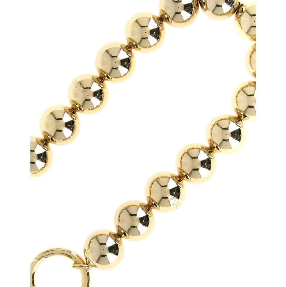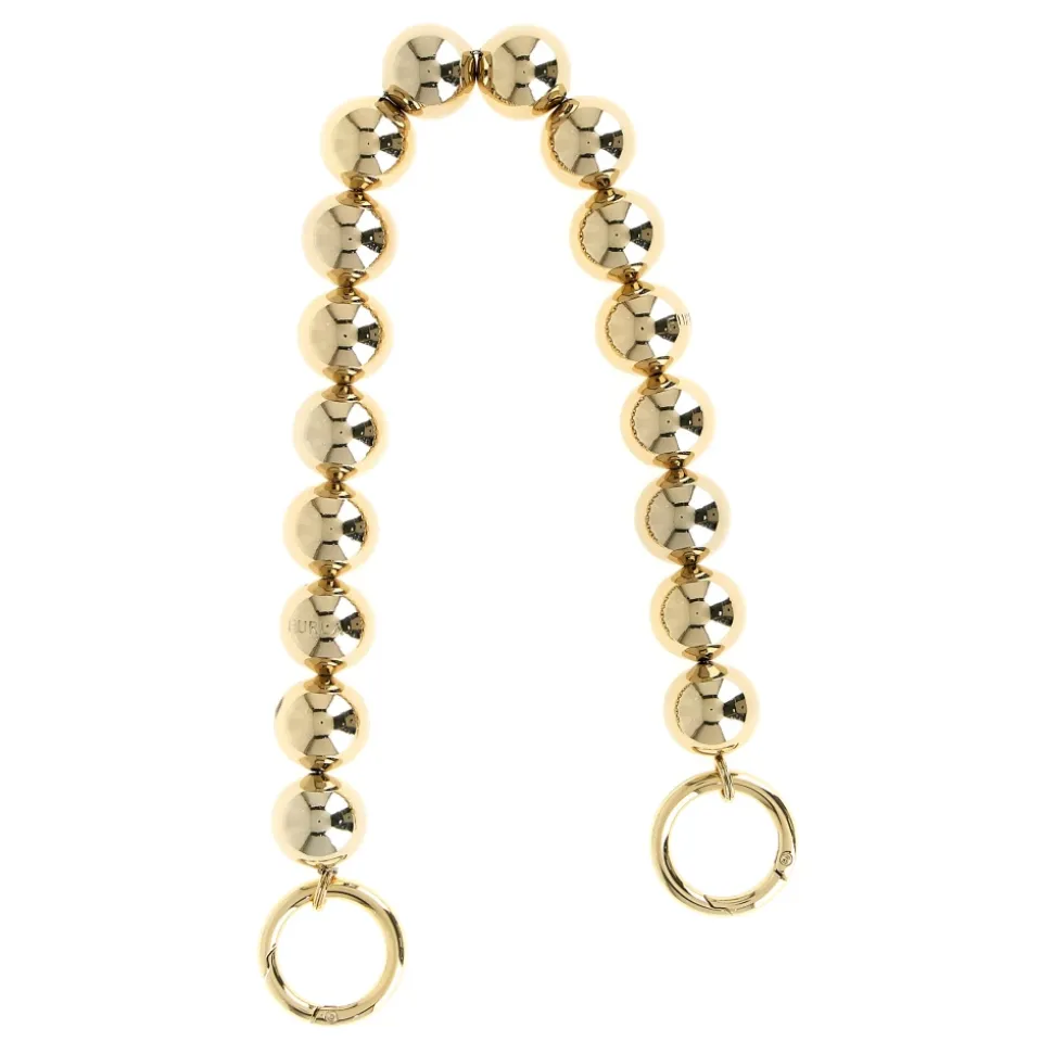 Furla Myfurla Taskehanke er et blankt metalaccessorie designet til at fastgøres på tasker og tilføje visuel interesse. Den har et kuglemønstret Sfera-motiv og karabinhager med snaplås for hurtig fastgørelse. Nøgleattributter: Gul | Guld | Metal | Guldbelægning | Karabinhager med snaplås til fastgørelse | Graveret Furla-logo | Sfera (kugle) motiv | Blank finish på metalkugler | Mål og pasform: Remlængde: 41,5 cm | One size | Fast længde | Sammensætning og pleje: 85% messing | 15% metal