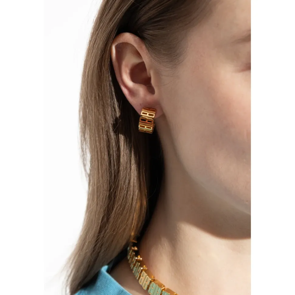 Balenciaga Nano Hoop Earrings kombinerer en kompakt hoopsilhuet med en poleret, højglansfinish. Parret er udført i guldfarvet messing og har et indgraveret Nano BB-logo for en raffineret hverdagsaccent. Vigtigste egenskaber: Guld | Guldfarvet messing | Nikkelfri | Blyfri | Hypoallergen | Runde stoppere ved baglukning | Til huller i ørerne | Sælges som par | Afrundet hoopsilhuet | Gentagne rektangulære segmenter med åbne udskæringer | Indgraveret Nano BB-logo | Højglansfinish | Mål og pasform: Længde: 0,8 cm | 0,81 cm | Højde: 1,6 cm | 1,6 cm | Bredde: 1,2 cm | 1,22 cm | Vægt: 5,5 g (hver) | Sammensætning og pleje: Guldfarvet messing | Aftørres med en blød, tør, naturfarvet klud. Brug ikke aggressive kemikalier. Undgå langvarig udsættelse for direkte varme eller sollys. Beskyt mod væsker og stød; hvis den er våd, tørres den straks. Opbevares i pose efter brug.