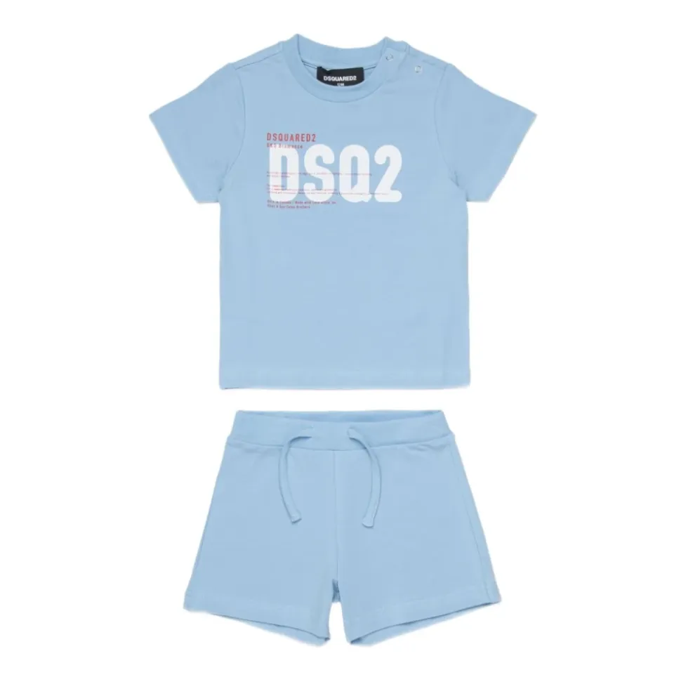 Dsquared2 Newborn Logo Tracksuit er et todelt sæt designet til hverdagsbrug, der kombinerer en trykt T-shirt med rund hals med lette shorts med snøre for behagelig bevægelse. Nøgleattributter: Blå | Klarblå | Bomuld | Strækstof | Trykknaplukning ved skulderen | Snøre i taljen | Sidelommer | Rund hals | Korte ærmer | Trykt logo | Todelt sæt | Sammensætning & pleje: 95% bomuld, 5% elastan