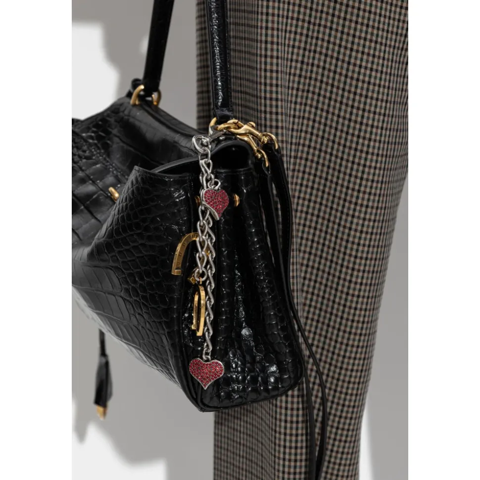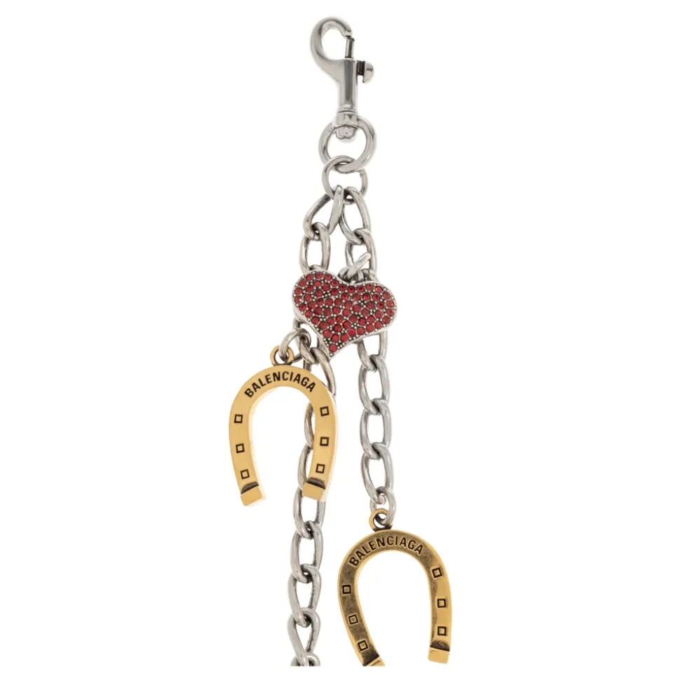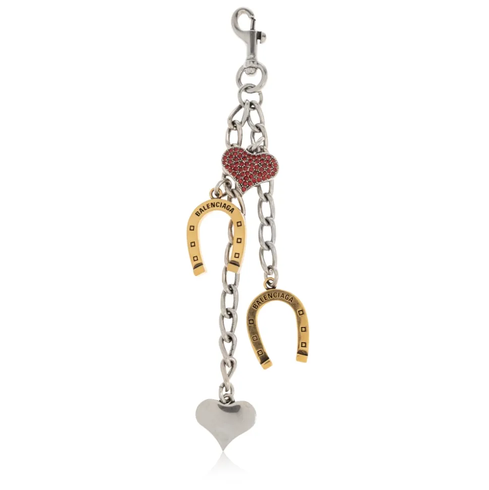 Balenciaga nøglering med charms kombinerer en robust sølvkæde og karabinhage med dekorative charms, der giver en raffineret, bærbar accent. Stykket skiller sig ud med sin blanding af sølv- og gulddetaljer, graverede hestesko og to hjerteformede charms – den ene sat med røde sten. Nøgleattributter: Grå | Sølv | Stål | Holdbar konstruktion | Højglans metalfinish | Karabinhagelukning for nem fastgørelse | Kan bruges som nøglering eller taske charm | Kontrasterende sølv- og guldaccenter | Guld hestesko charms med indgraveret designernavn | To hjerteformede charms – en med røde sten, en med glat finish | Robust kæde og polerede hardware | Sammensætning & pleje: Stål | Jern | Messing | Krystal